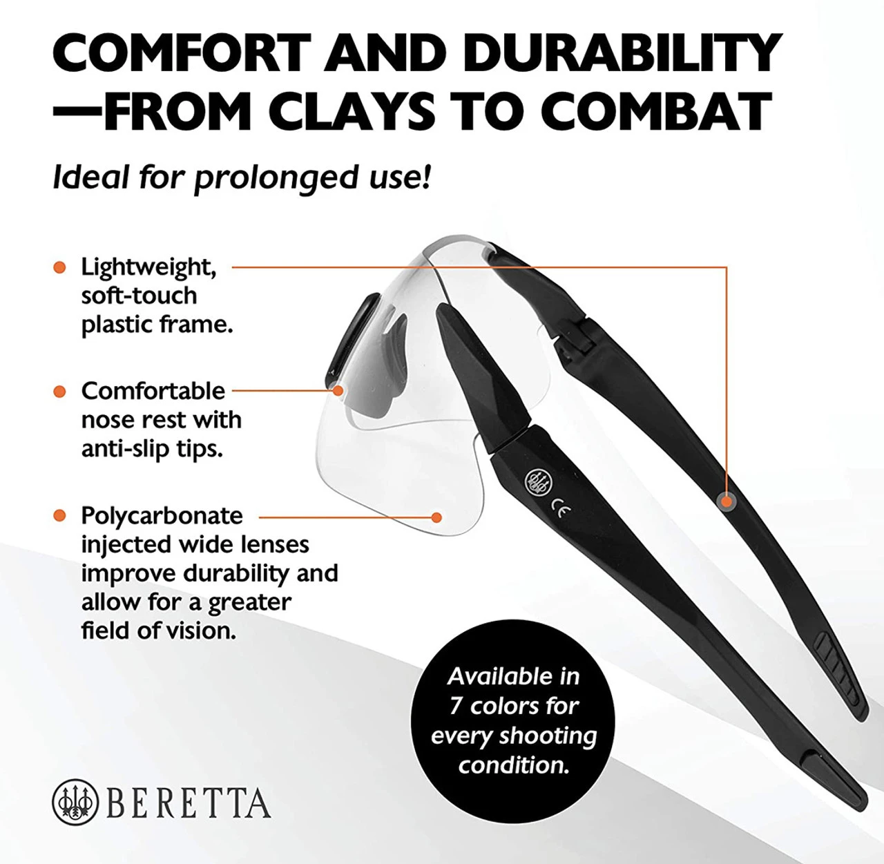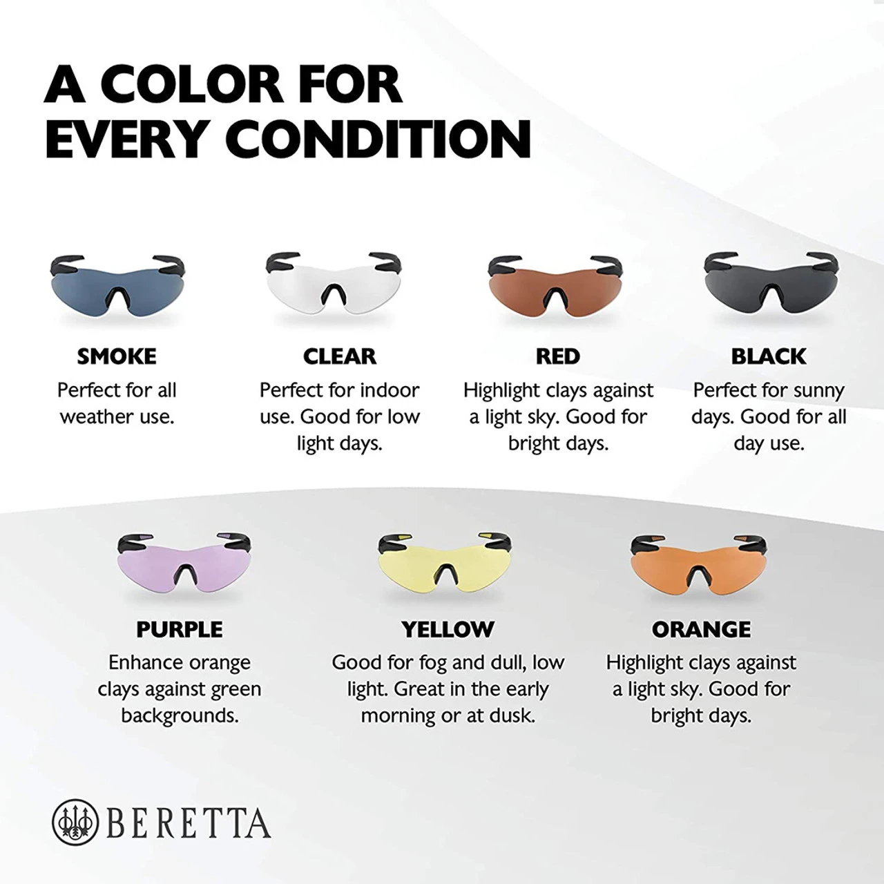 The Beretta Performance Plastic Frame Shooting Glasses are lightweight, plastic frame, performance shooting shields that feature a soft touch frame, comfortable nose rest, and anti-slip tips. The improved design of the polycarbonate injected wide lenses allows for a greater field of vision and increased protection. Cleaning soft bag included.