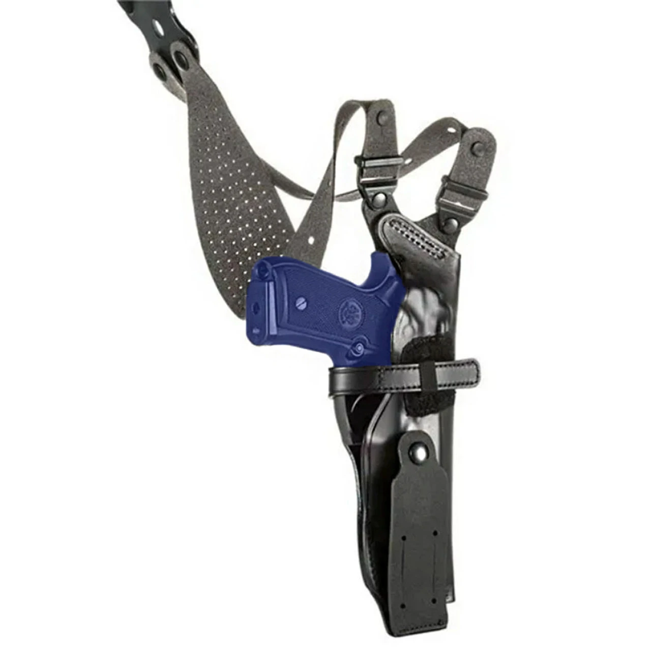 The Beretta Leather Shoulder Holster for concealed carry for the Beretta 90 Series full size pistols. This holster is for pistols without an accessory rail and with a standard slide configuration (i.e. not Brigadier or 92A1); configured for left-handed users.