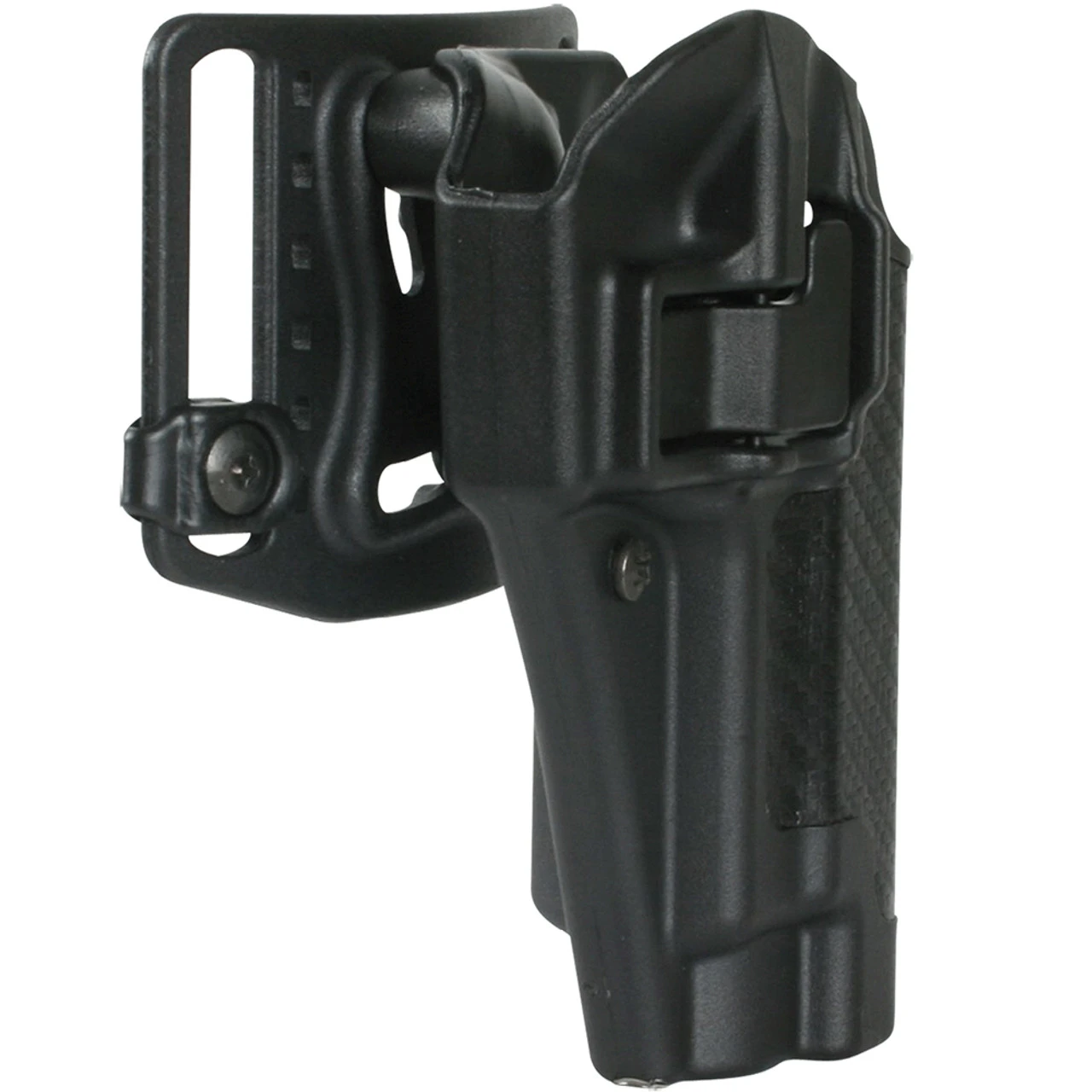 Unlike thumb breaks, which can sometimes be difficult to fasten one-handed, the SERPA lock allows you to re-holster quickly and securely every time, using only one hand. The SERPA holster has the same speed cut and concealment enhancing design of the Blackhawk Standard Model Carbon Fiber Holster.