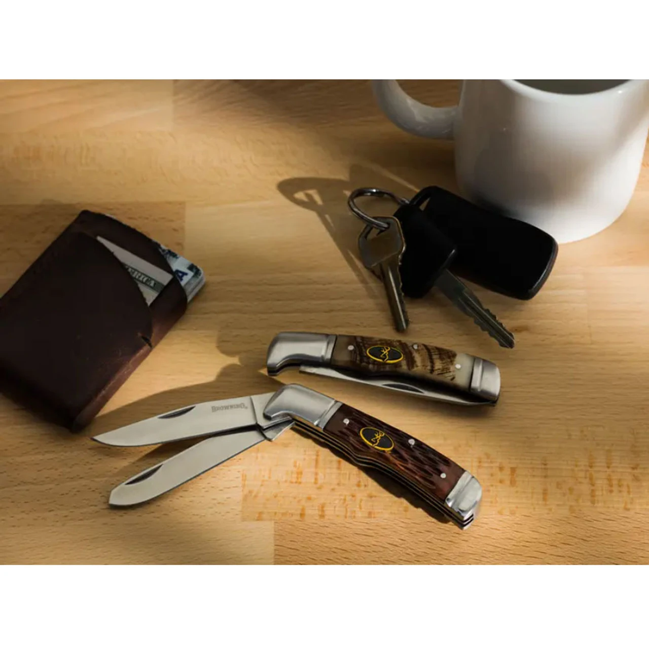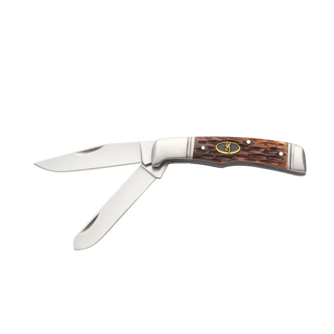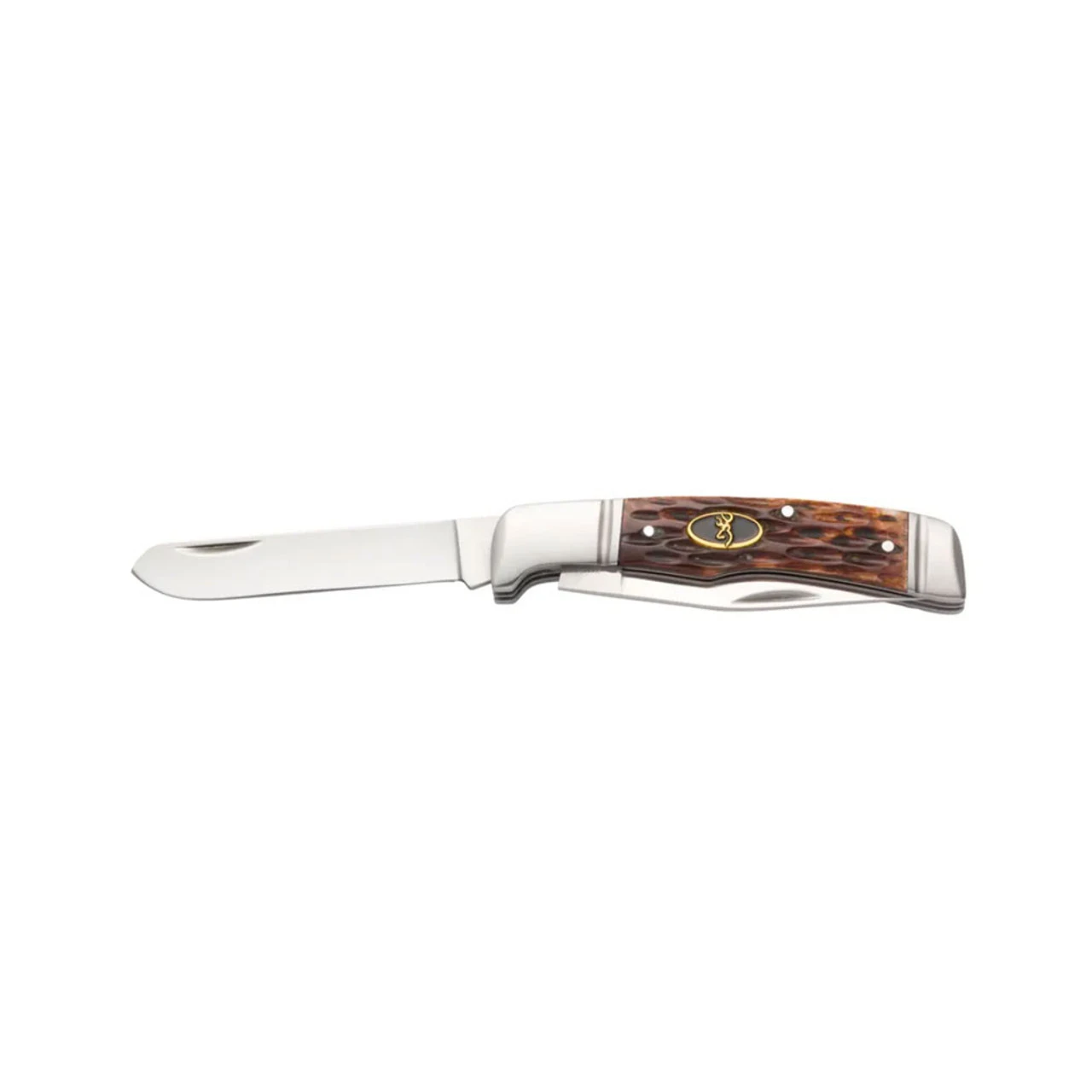 The BROWNING Joint Venture 2 Blade Jigged Bone Folding Knife is a traditional slip joint folding knife with two 8Cr13MoV stainless steel drop point blades, jigged bone handle scales, nail nick opening on both blades, and stainless steel bolsters and Buckmark medallion.