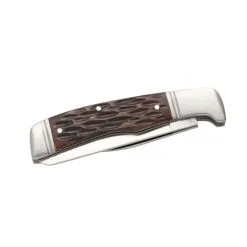 - Jigged bone handle scales with stainless steel bolster and Buckmark medallion