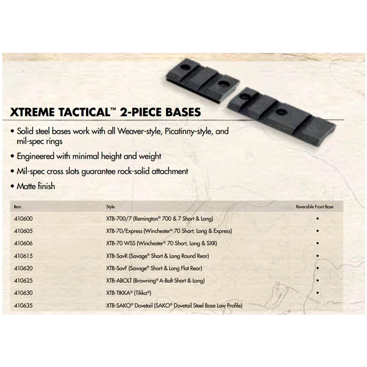 The BURRIS XTB Xtreme Tactical Steel 2-Piece Base, Remington 700 (410600) is crafted from solid steel and engineered for maximum mounting flexibility and minimal height and weight. Mil-spec cross slots guarantee rock-solid attachment with any and all Weaver-style, Picatinny-style or mil-spec rings. The front base is reversible to provide multiple ring positions to accommodate various scope lengths.