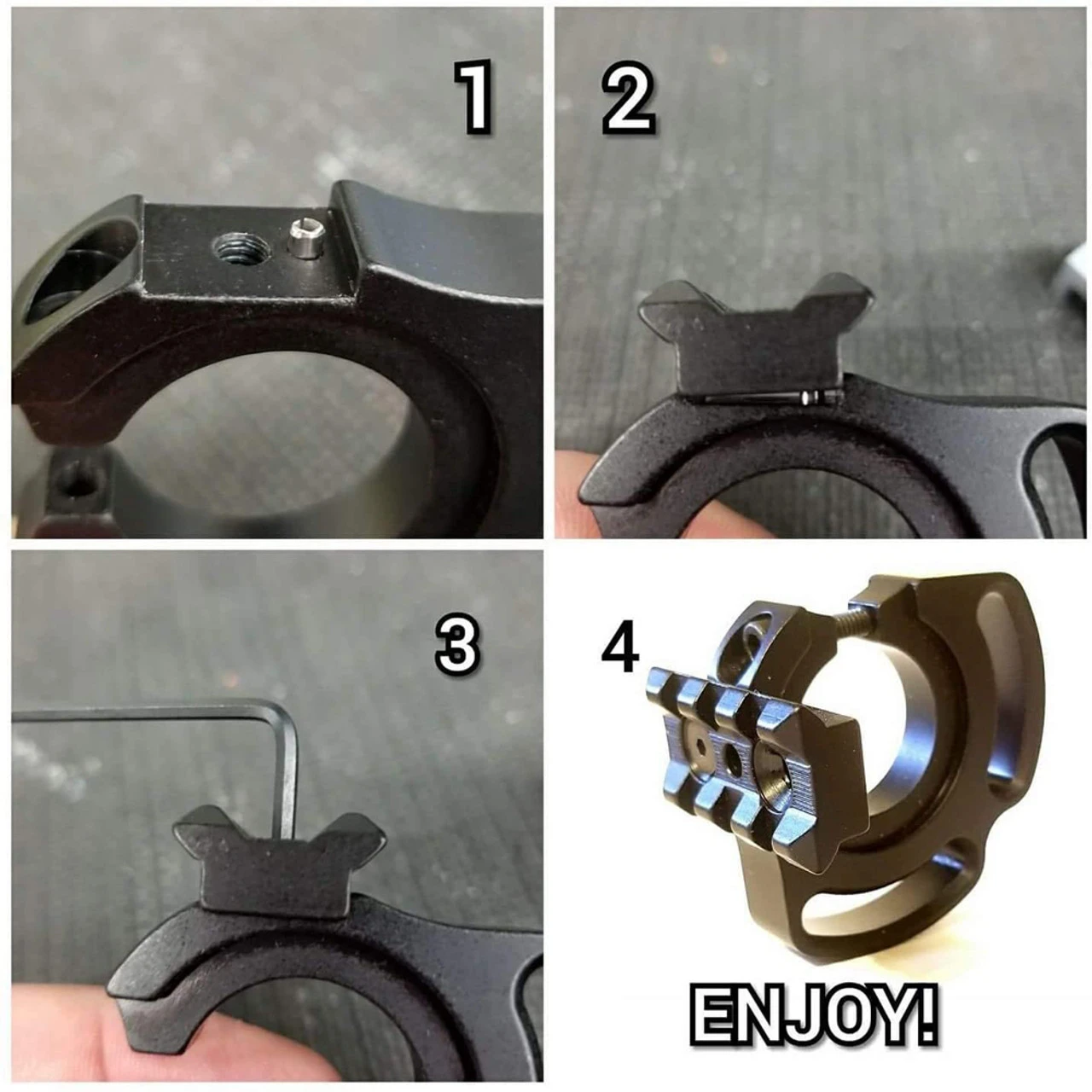 The CDM Gear LLC MTR shotgun light mount is designed to mount rail mounted tactical lights and lasers on Mossberg 590A1, Mossberg 500 shotguns. This 1.8oz. clamp fits in a 1/2″ of space so it is perfect for the Mossberg 590A1 and just about any other shotgun with a 25mm magazine tube and room to mount it. This mount can be positioned 2 ways, left or right, and provides a solid “lock up” around the tube. Each position allows for a sling to be used with the included undermount sling slot/hand stop. Additionally there is provision for a QD push button sling swivel (sling swivel not included and sold separately, shown for example only). Provision for an additional rail on the opposite side is also available (additional rail is sold separately). Manufactured from aircraft grade aluminum and hard coat anodized it is a superior mounting solution for those with limited space mounting requirements. One tool for one bolt is all that is needed to attach and remove the clamp or light in seconds. Fits Mossberg 590A1 Heavy Millspec Barrel, Mossberg 930 SPX, Mosberg 500, 590 and Ithaca Shotgun Magazine Tubes. Not meant to clamp a magazine tube extension but will stop it from rotating. Does not include sling swivel or sling components.