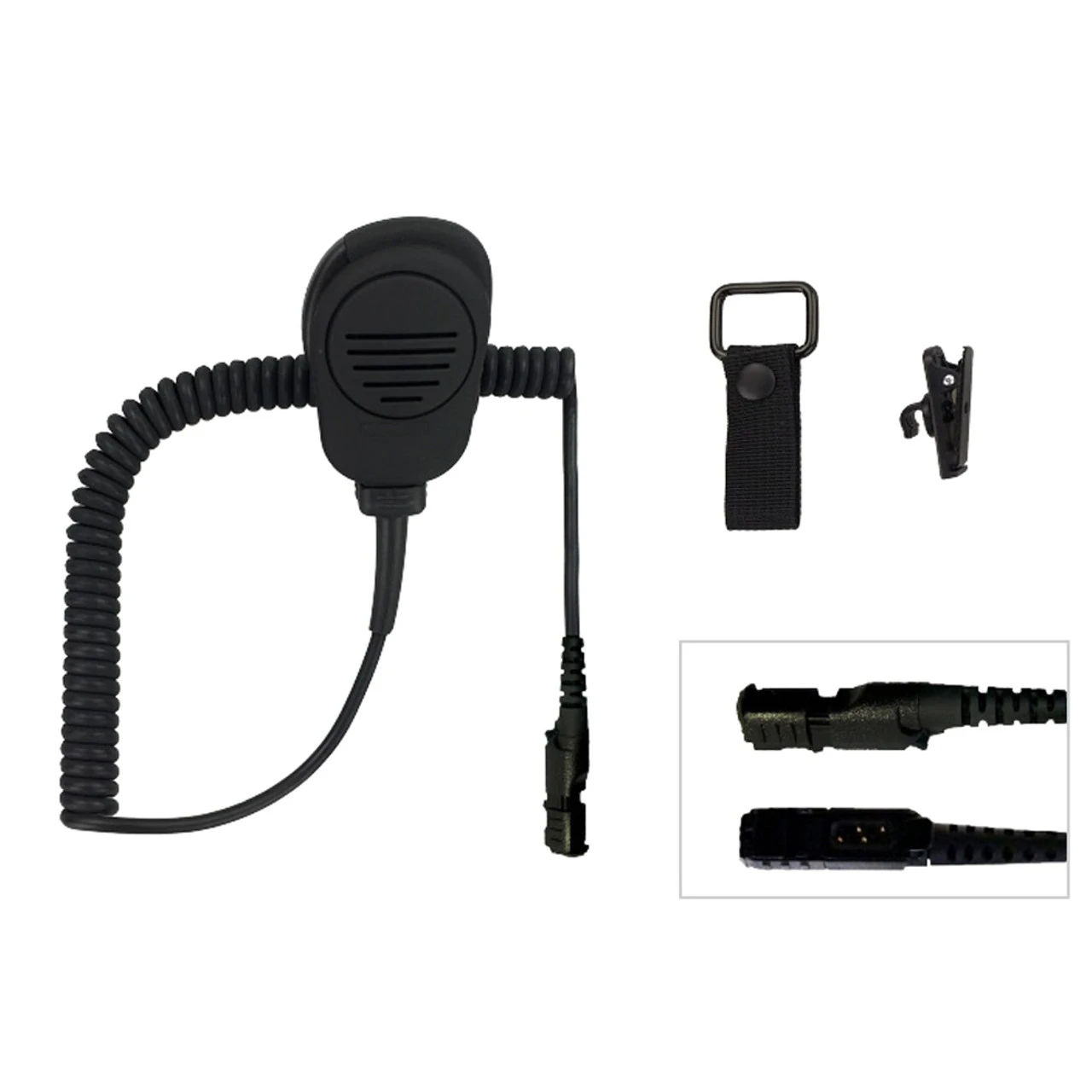 Extend your radio to your shoulder or chest with the rugged and reliable EAR HUGGER SAFETY Speaker Microphone for Motorola MOTOTRBO mini, DEP, MTP, XIR, XPR (EH-SM-1027). The Remote Speaker Microphone features a high-quality microphone and speaker for loud, clear sound. Use the 3.5 mm audio jack with your earpiece for privacy. Ideal for patrol, security, construction and military use.