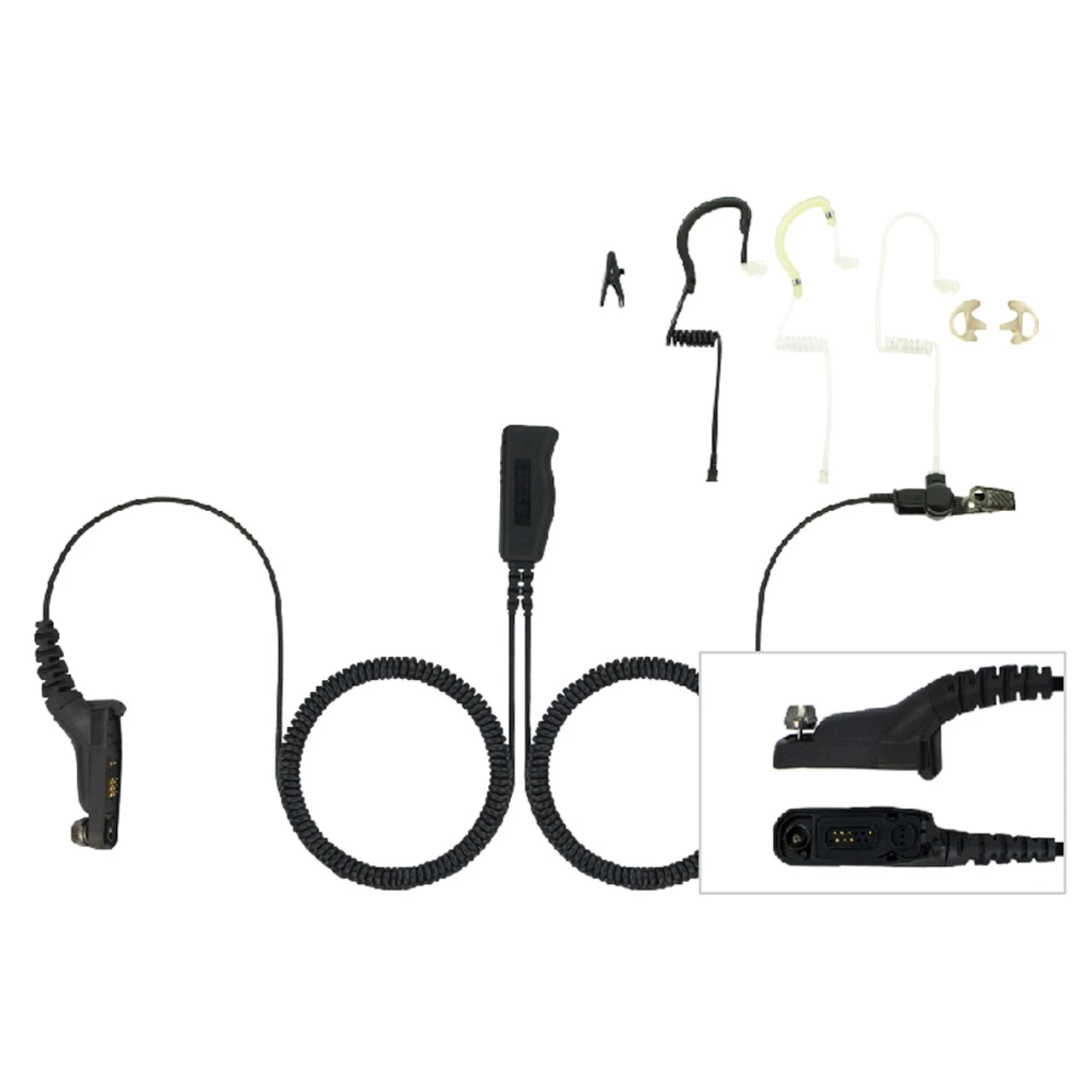Transmit clearly and receive discreetly with the streamlined EAR HUGGER SAFETY Two-Wire T-Series Headset for Motorola MOTOTRBO, XPR, APX (EH-PM2-1006). Hear your radio clearly with the integrated T-Series Earpiece. Transmit clearly the first time, every time with the noise-cancelling, palm microphone. Perfect for security, patrol, surveillance and more.