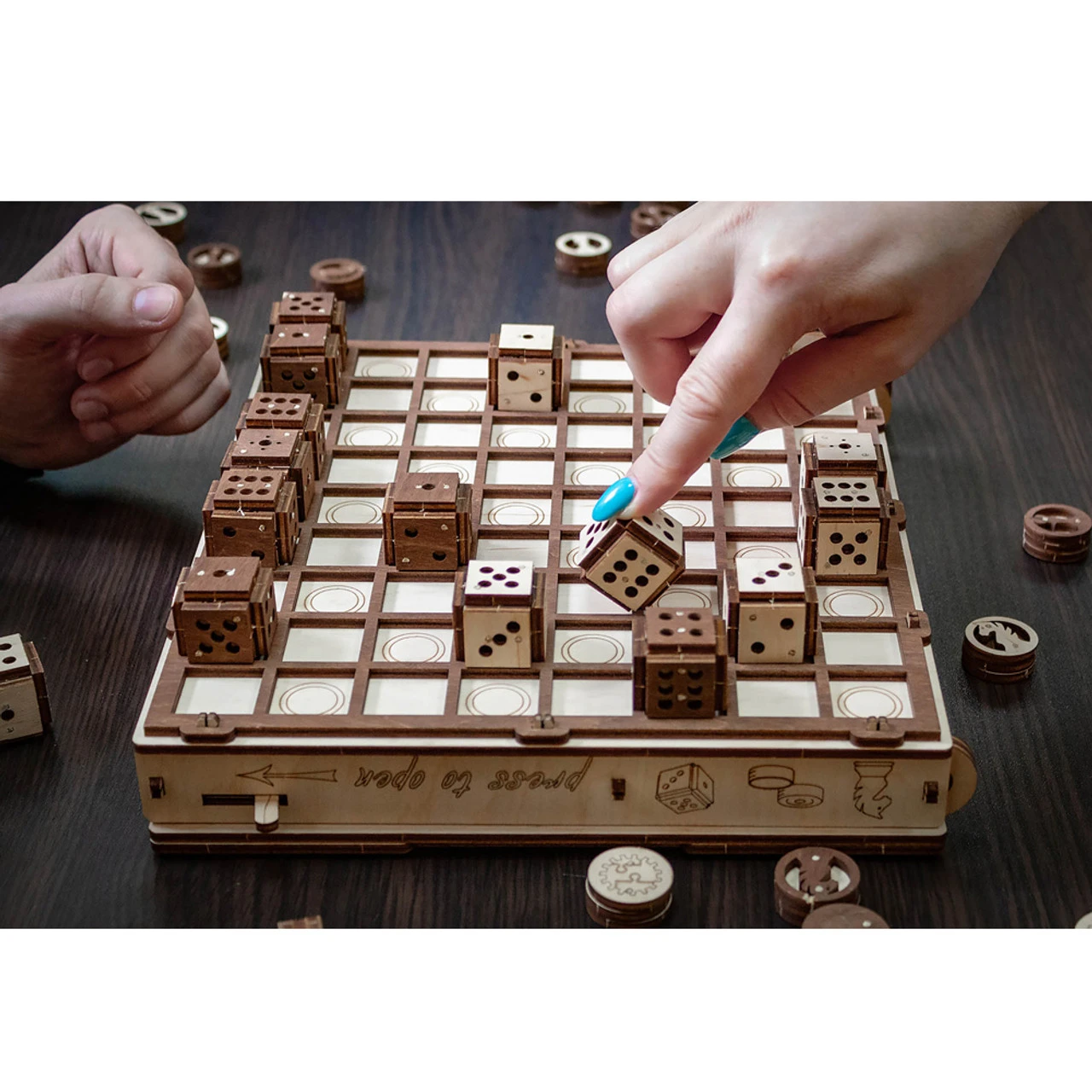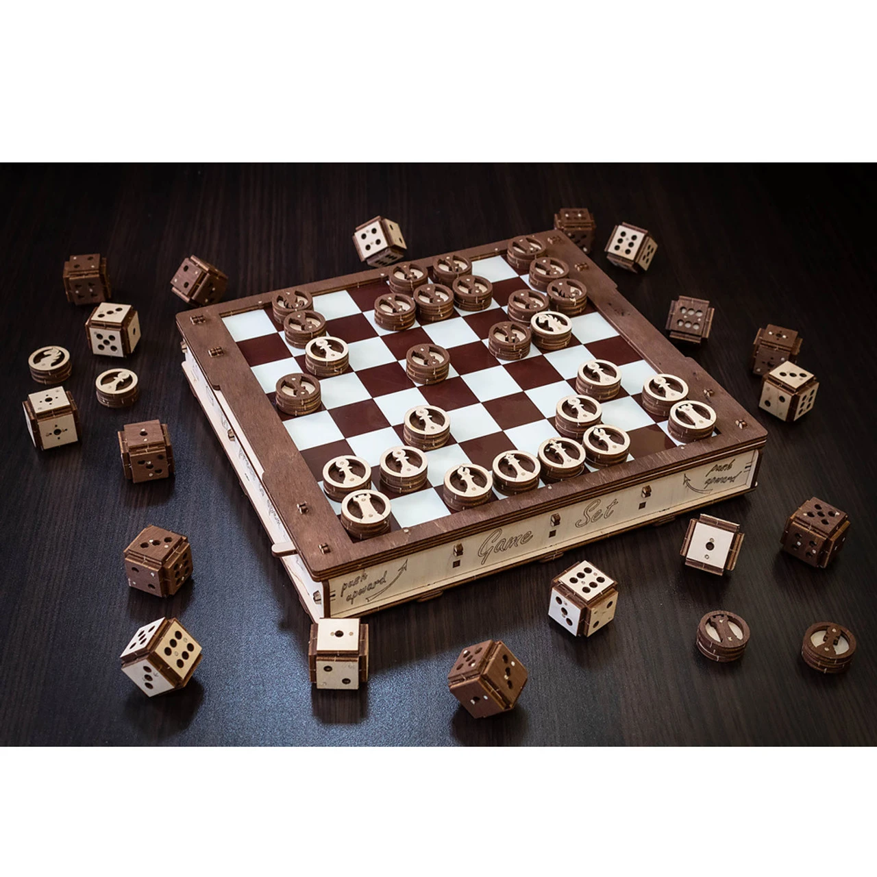 The ECO WOOD ART Gameset 620-Piece 3D Puzzle (GAMESET) is a mechanical 3D-puzzle of the classic board games: Chess, Checkers and the mathematician game ‘Battle’ (rules of the game are included). The kit includes details of the playing field and playing pieces to assemble. The two-side field with rubber-band locks acts as a box for playing pieces: easy to carry and play everywhere!