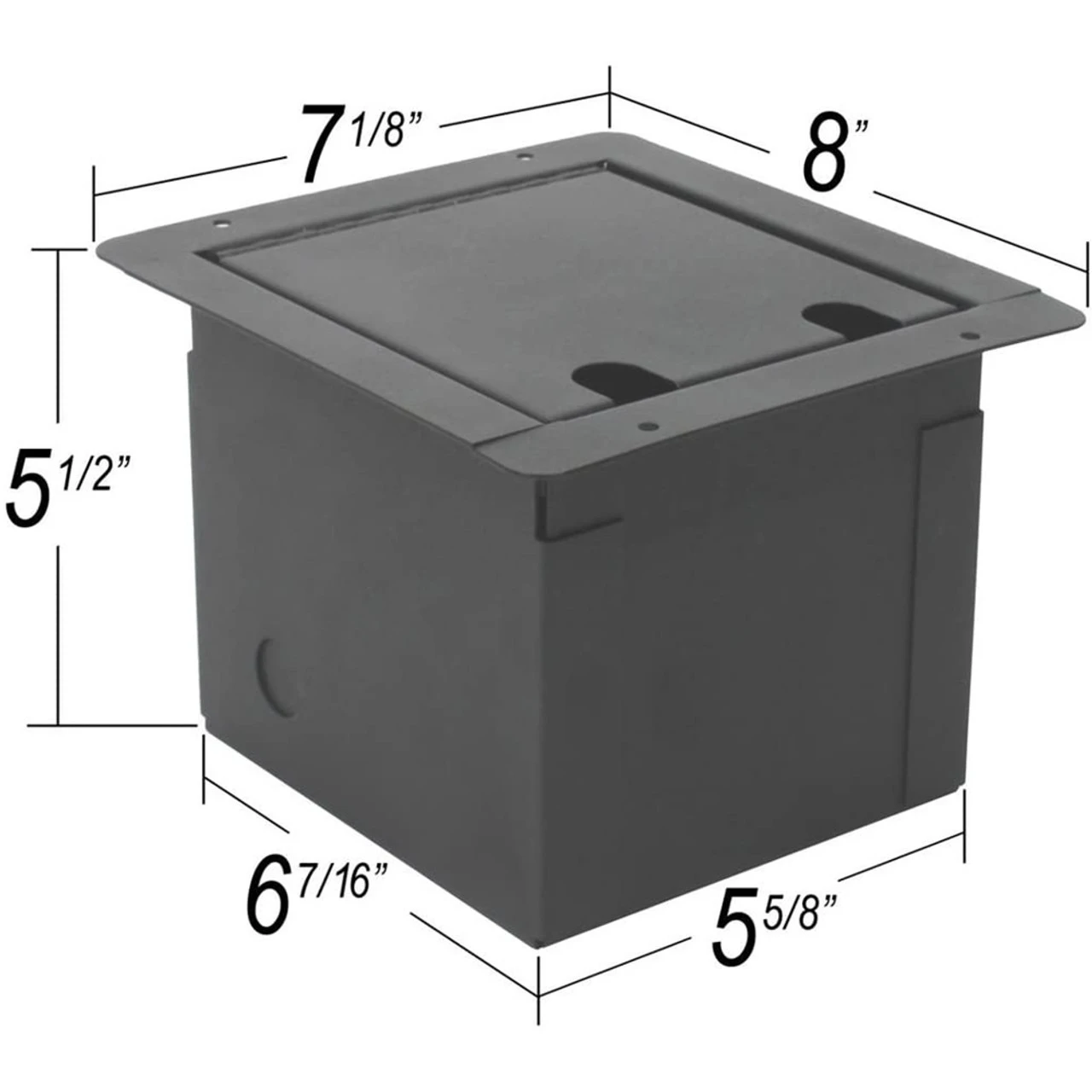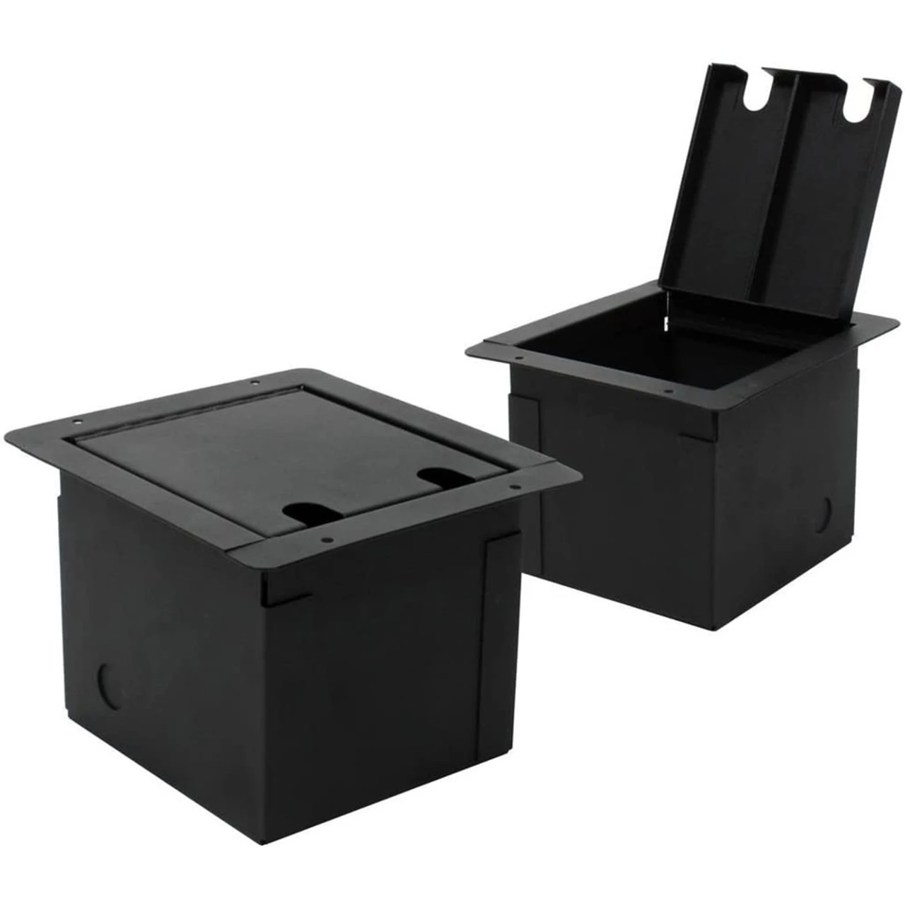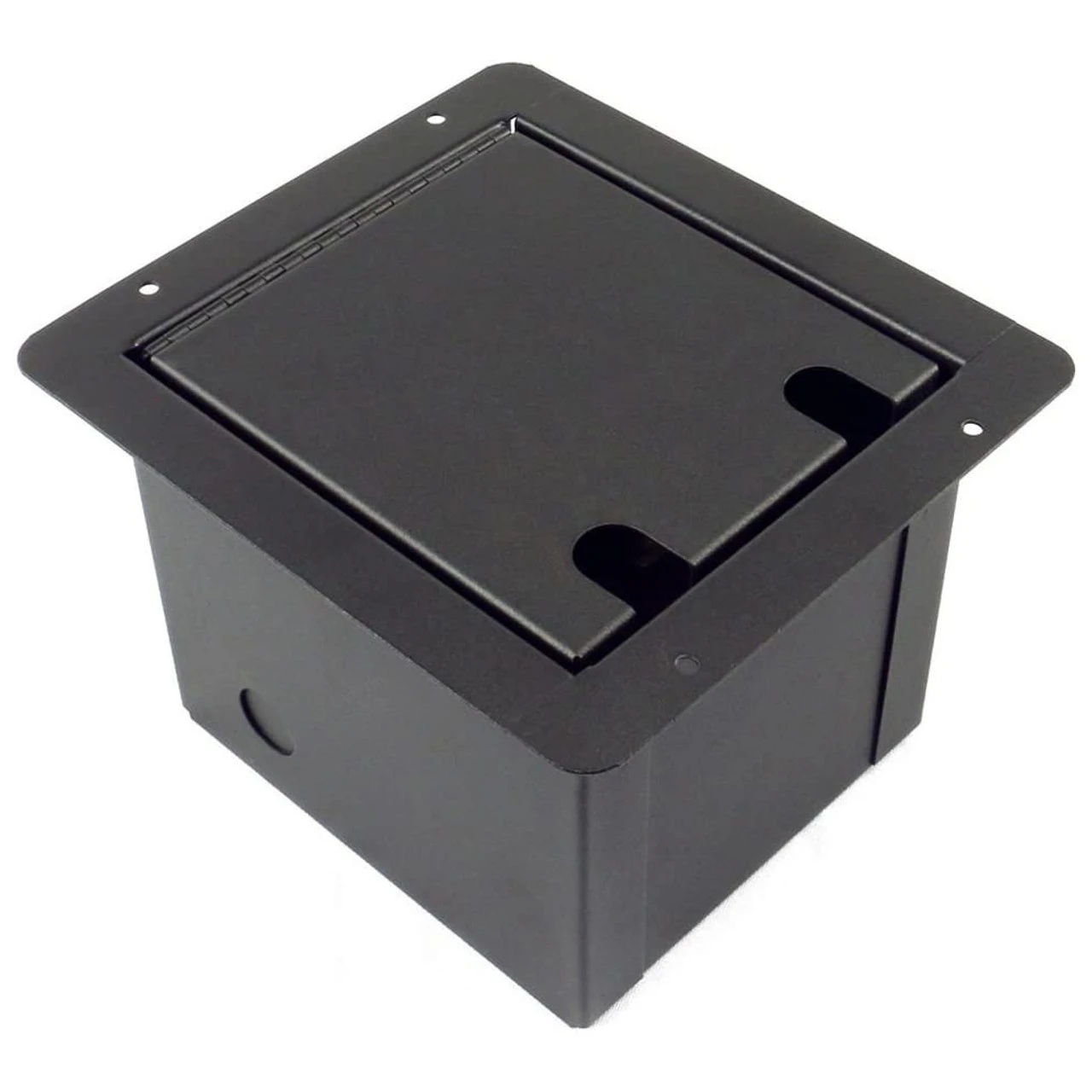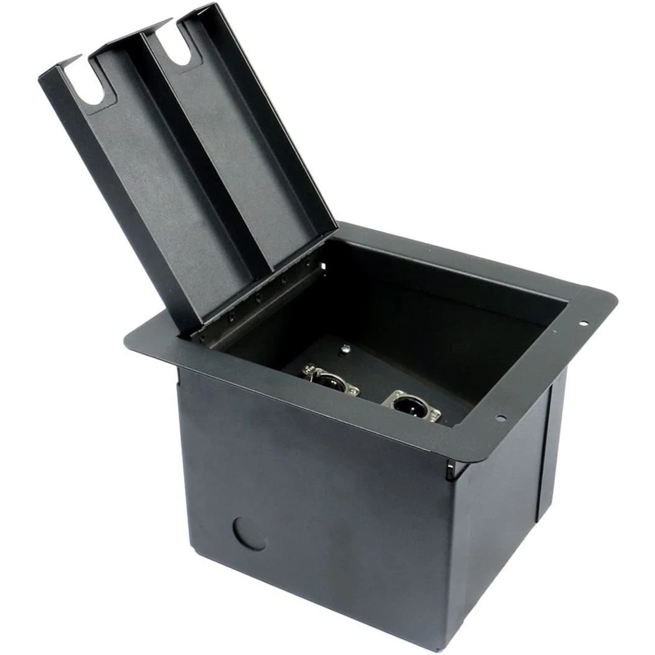 Sturdy metal floor box with hinged access. Used for Microphone Connections, great for theaters, churches, schools, etc. Recessed floor boxes are constructed from heavy-duty steel and feature a hinged door with cable pass-though slots.