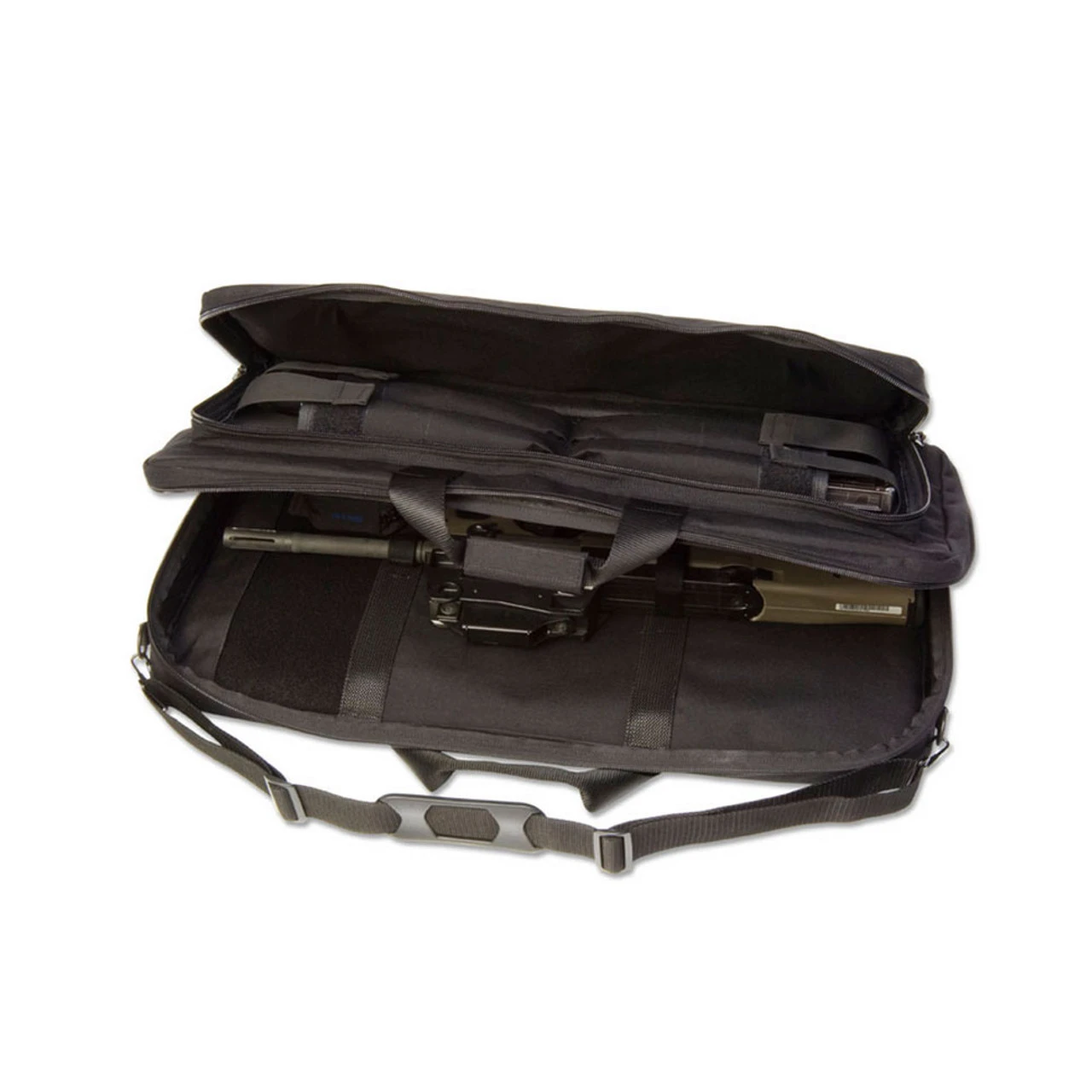 The main compartment has plenty of room for the weapon with scope attached. It has tie-down straps for the weapon, plus a tie-down for an FN cleaning kit and a velcro patch for removable accessory pouch. The gun case’s outside pocket is fully padded and has pouches for 4 magazines. Made in the USA.