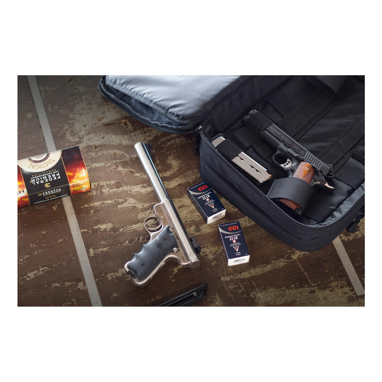 - Two identical compartments to hold two handguns each