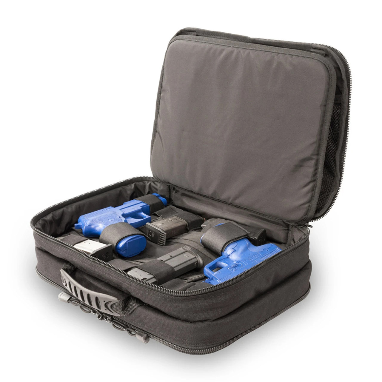 This discreet Case was designed with two identical compartments, one on each side. Both can hold two handguns and contain fully-adjustable straps and loops for magazines. Each compartment on this Pistol Travel Case has a separate accessory compartment with a padded divider inside. The accessory compartments have elastic loops and Velcro pouches for magazines, ammo and accessories – as well as a mesh pouch for cleaning supplies, paperwork, etc.