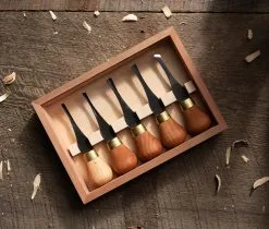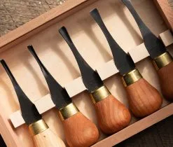 The FLEXCUT Premium Beginners Palm Set features broad, short knob handles in the European tradition. The handles are cut from fine cherry wood with a polished brass ferrule for strength, stability and long working life. The set comes in its own cherry box with a lid.