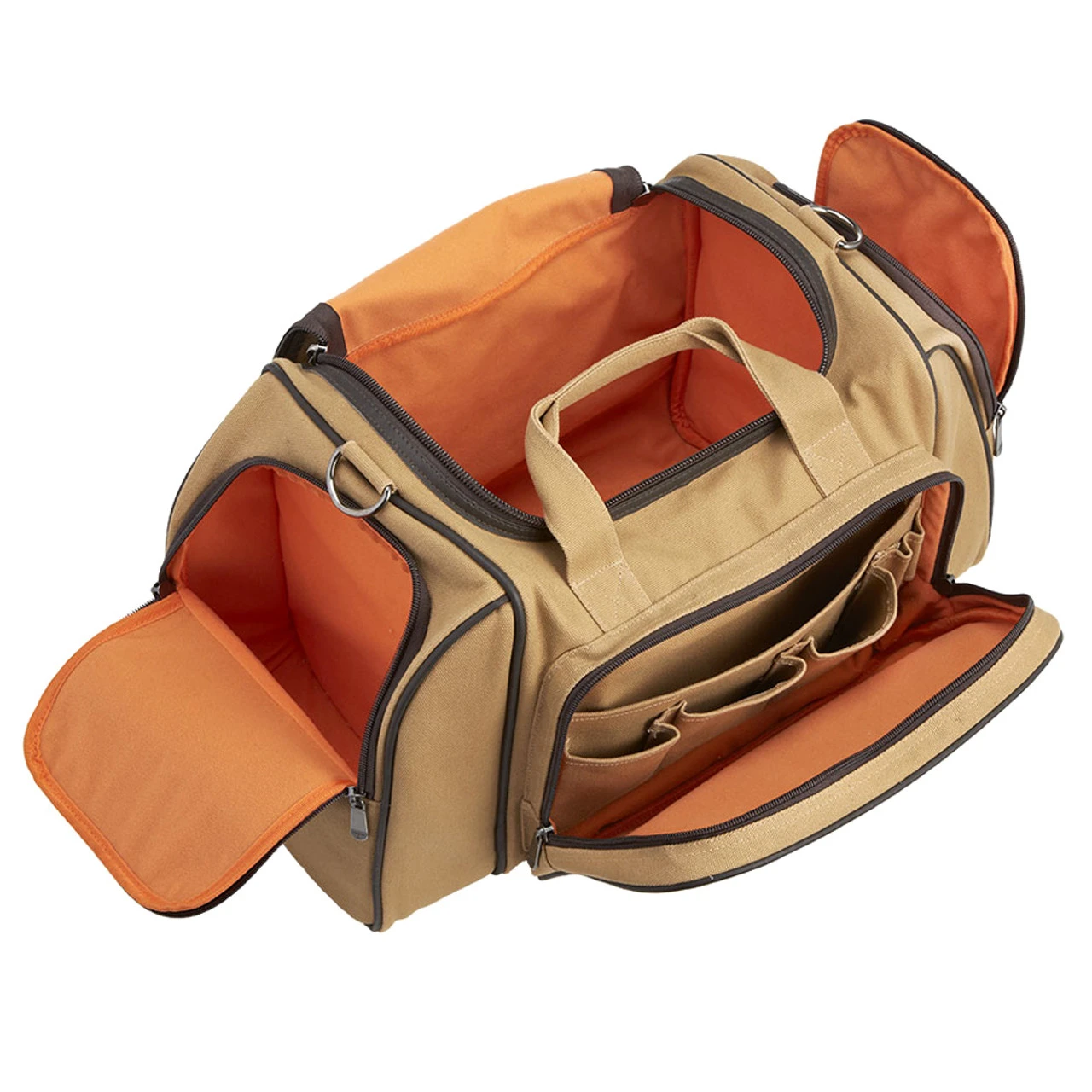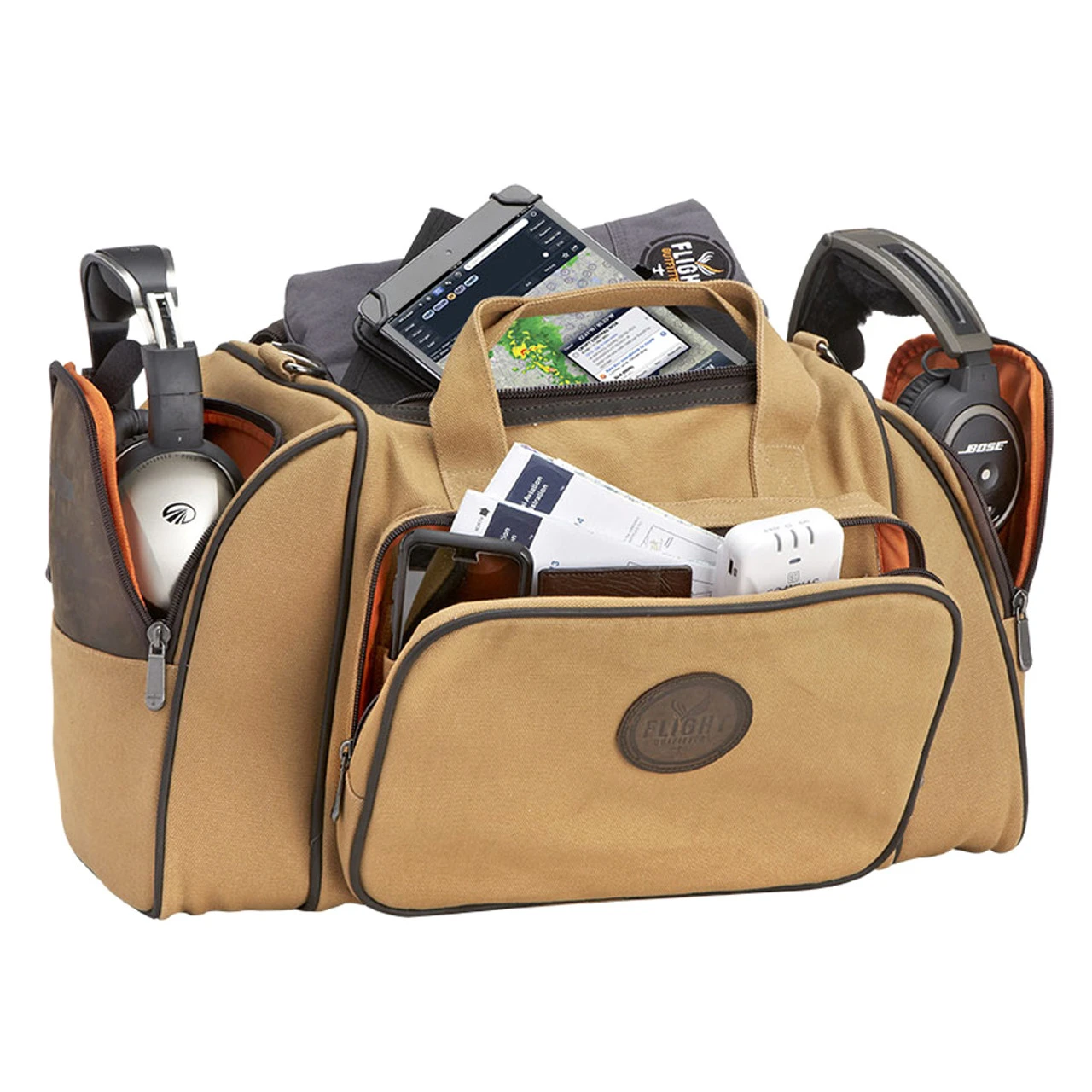 The Bush Pilot Bag is canvas with leather accents, and carries an embossed leather flight outfitters patch on the front. The inside of the Flight Level has the signature Flight Outfitters orange, making it easy to find gear in a dark cockpit.