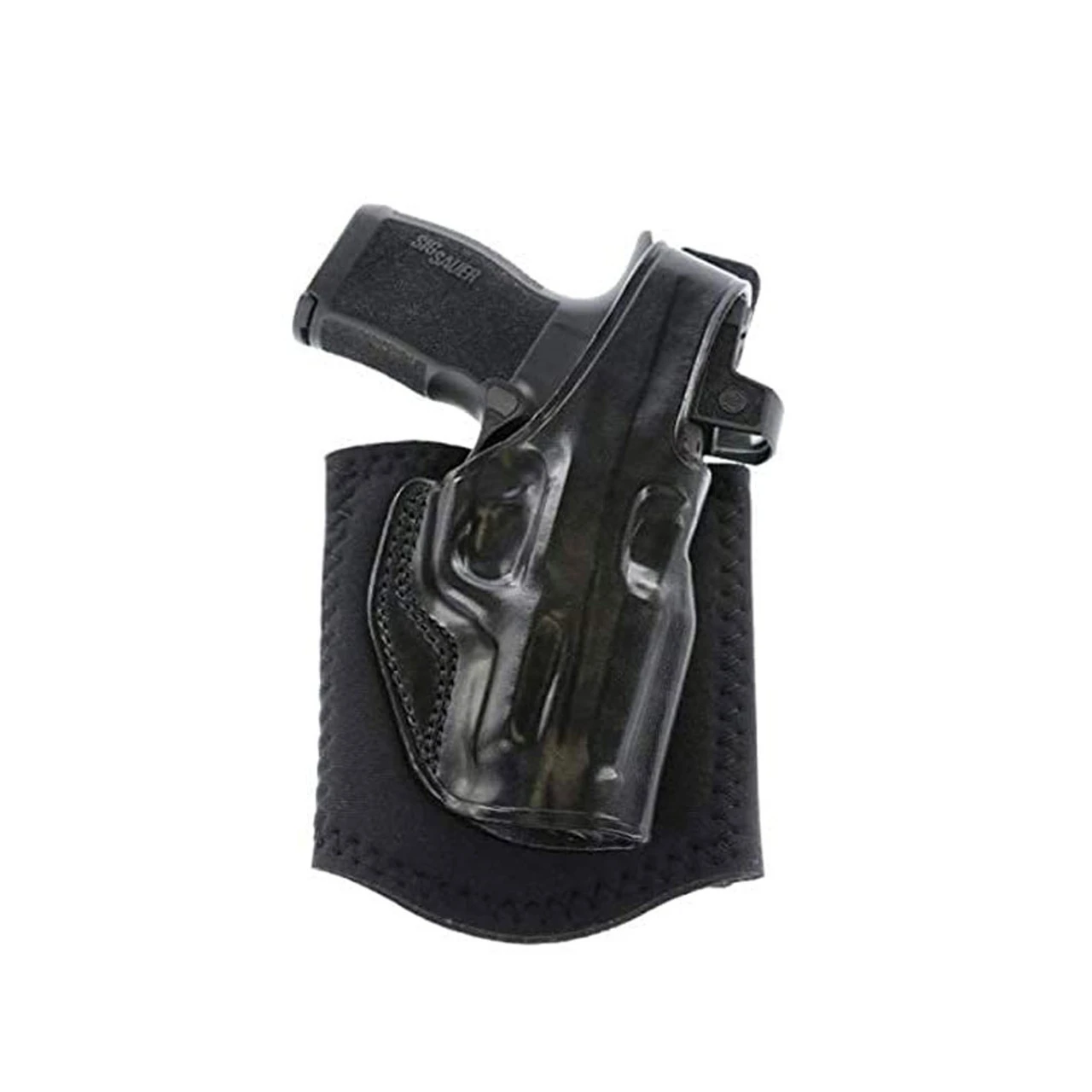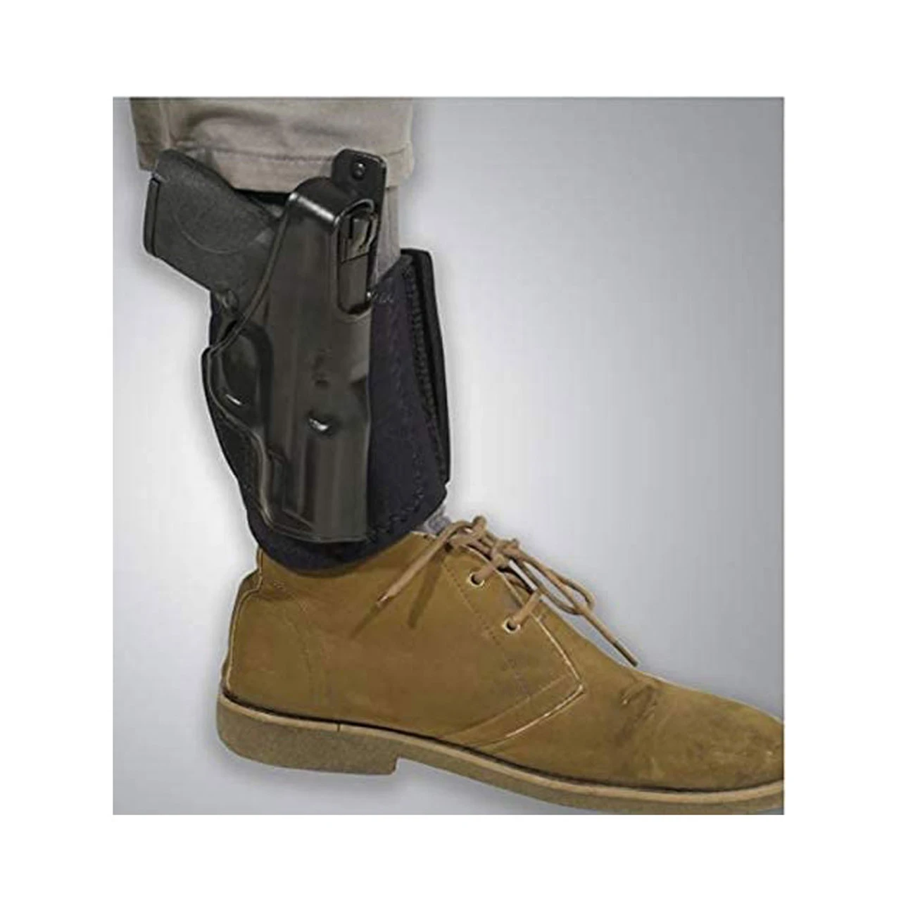 The Ankle Glove’s wide neoprene ankle band and hook-and-loop closure offer extended wearing comfort and unmatched security. Additional comfort is provided by sheepskin padding between the holster and ankle. It also features a reinforced thumb break for speed of draw and detailed molding for firearm retention.