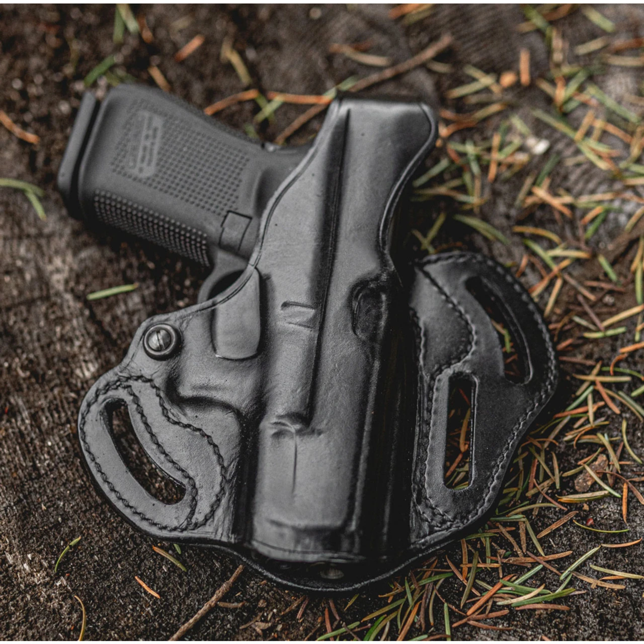Galco’s Cop 3 Slot holster is precision-molded and allows comfortable carry in both strong side and crossdraw positions. A tension screw adjustment near the trigger guard facilitates maximum firearm retention, while the rear sight is protected by a wide safety strap and reinforced thumb break. The low-cut design allows for easier, faster clearance of the firearm from the leather.