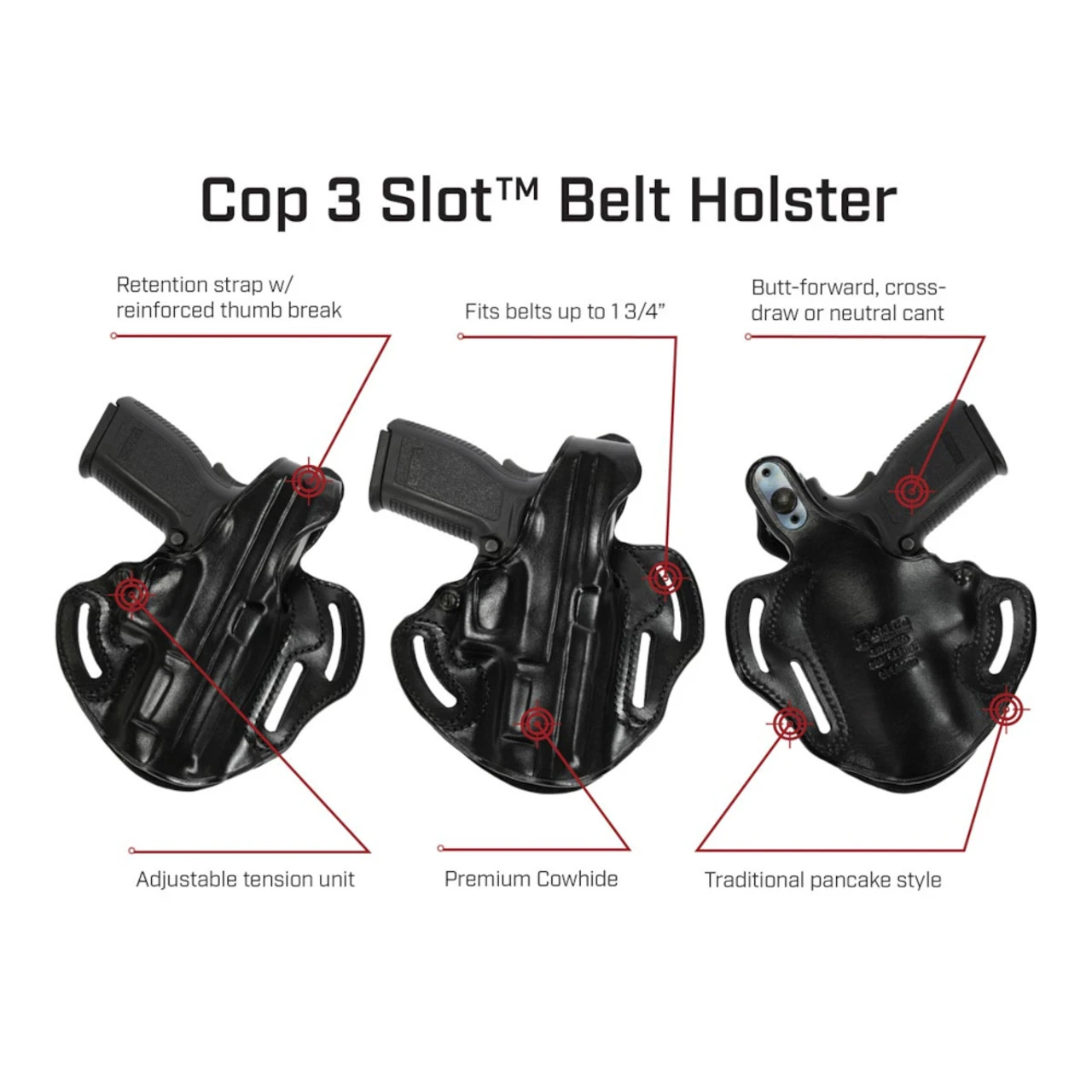 Made for semiautomatic pistols and double-action revolvers, the Cop 3 Slot holster is available in right or left hand designs in black finish.