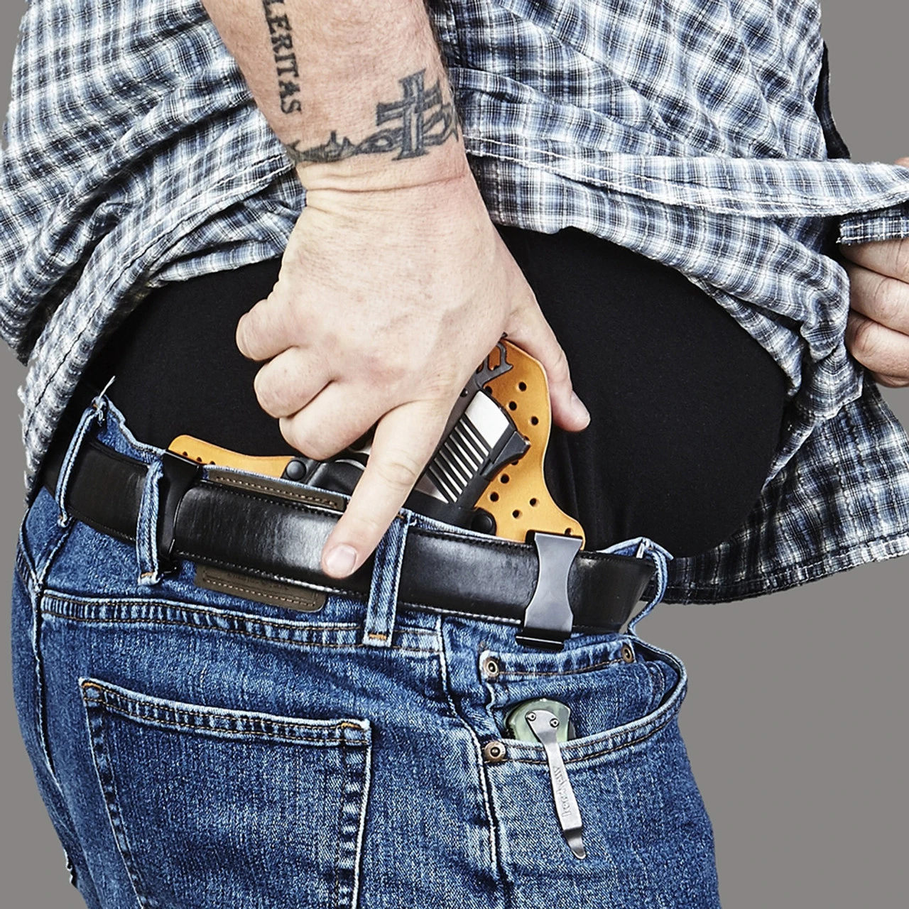 - Raised sweat guard to protect pistol and wearer