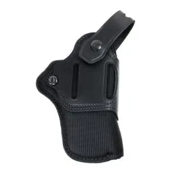 An ambidextrous exoskeleton made of top grain steerhide allows the belt to be threaded through either side of the holster body in strongside or crossdraw positions, for right or left hand draw. The safety strap has a hammer slot (not available on models for single-action revolvers) and is reversible for ambidextrous use.