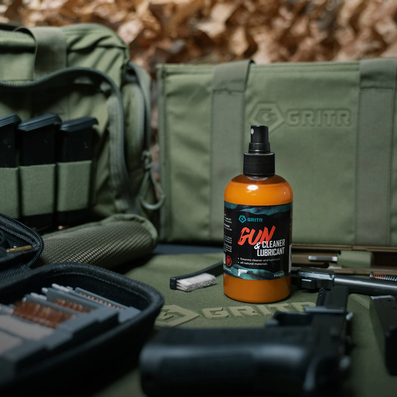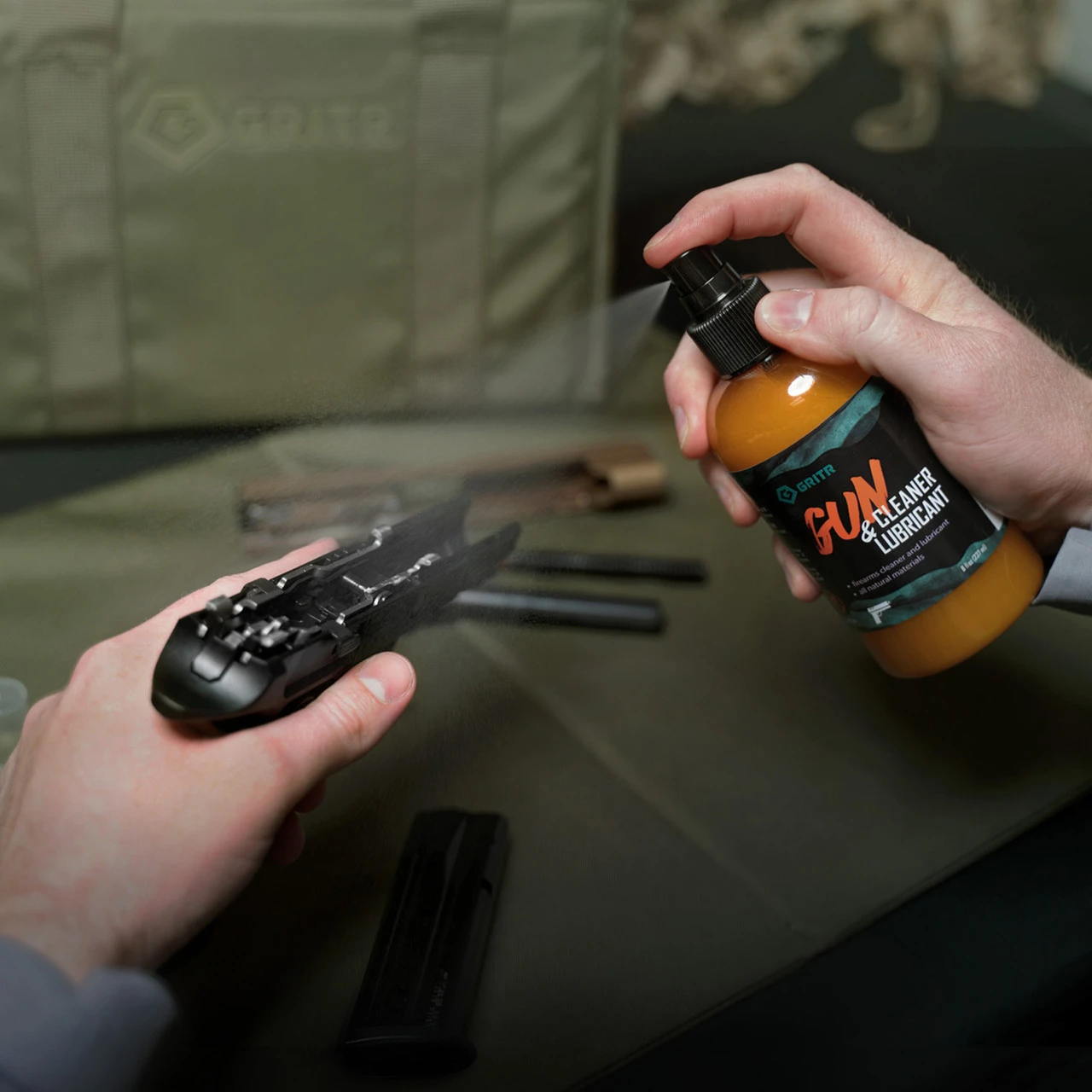 Are you looking for an all-purpose gun cleaner? Our GRITR Gun Cleaner, Lubricant & Protectant is an all-in-one gun solvent suitable for maintenance of various gun models. Successfully eliminates oil, dirt, copper, lead, grime, and other contaminants, even in areas that are not easily accessible. This gun oil lube forms a protective barrier between metal pieces and prevents gun parts from wearing and tearing and eventually breaking. Store your firearms, knowing that the next time you need them, they will be well protected.
