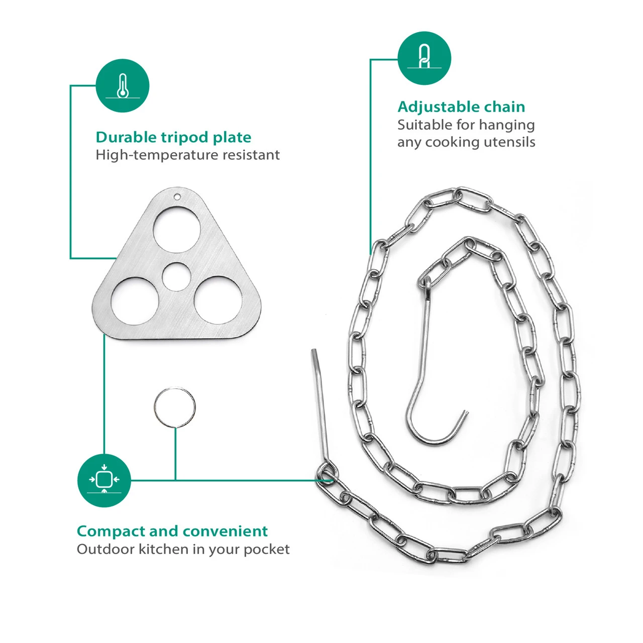Easy to Install – Combine the tripod plate with three branches or wooden/bamboo sticks that you can find anywhere to turn them into a simple stable tripod. Put the branches or sticks through the tripod plate, put the chain through the middle hole, and you will get a campfire tripod ideal for outdoor cooking. The hanging chain can be adjusted to a suitable grill height, for more convenient cooking.