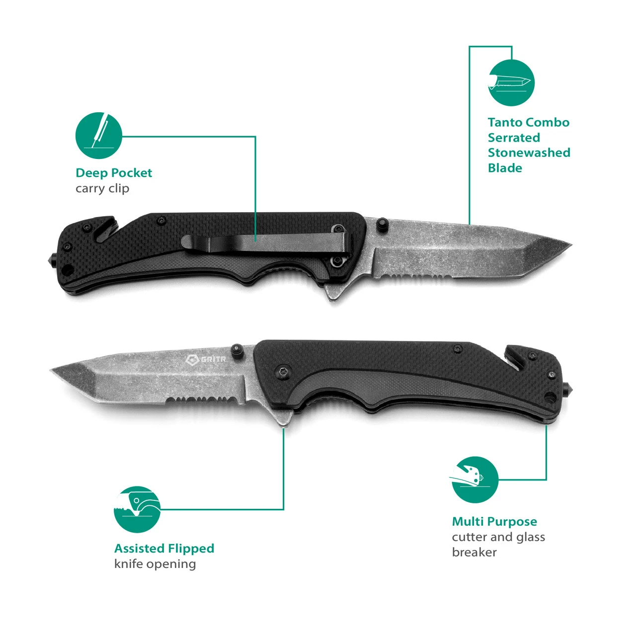 GRITR CRUCIBLE TACTICAL RESCUE KNIFE is a multi-functional folding knife perfect for camping, hiking, hunting, fishing, and any other outdoor activity. This high-performance knife will be the perfect gift for men and women.