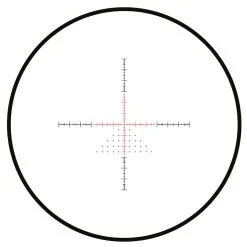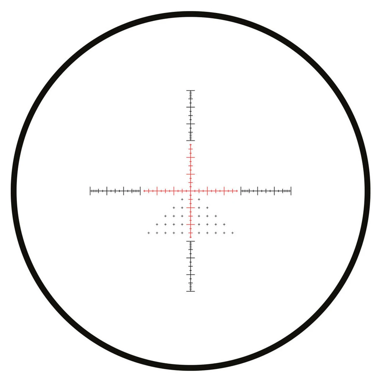 Hawke’s second focal plane (SFP) Half Mil Reticle has accurate spacing at the 10x magnification setting, with markings every half MRAD, plus .2 mil markings on the first and last MRAD markings past the 6 mil post, and also features a series of crosses on the lower portion of the reticle at 1 mil increments in a Christmas tree style. Markings are .2 mil, .5 mil, or 1 mil in height, and crosses are .2 mil high and wide.