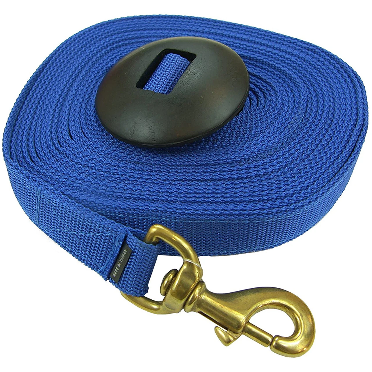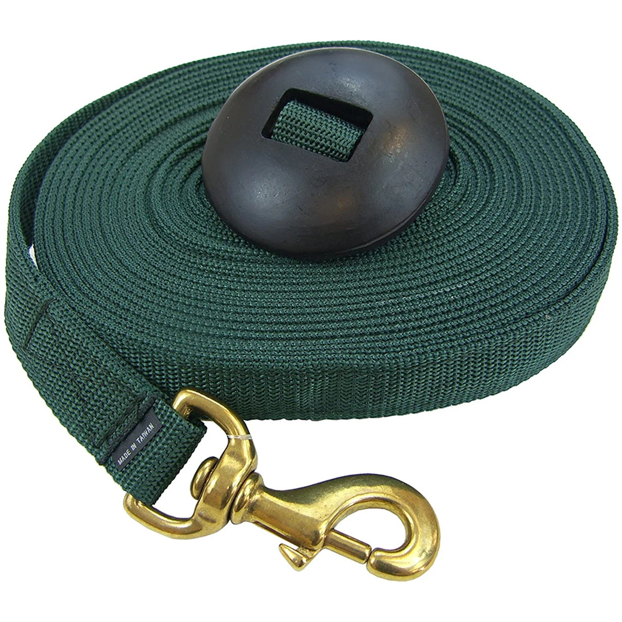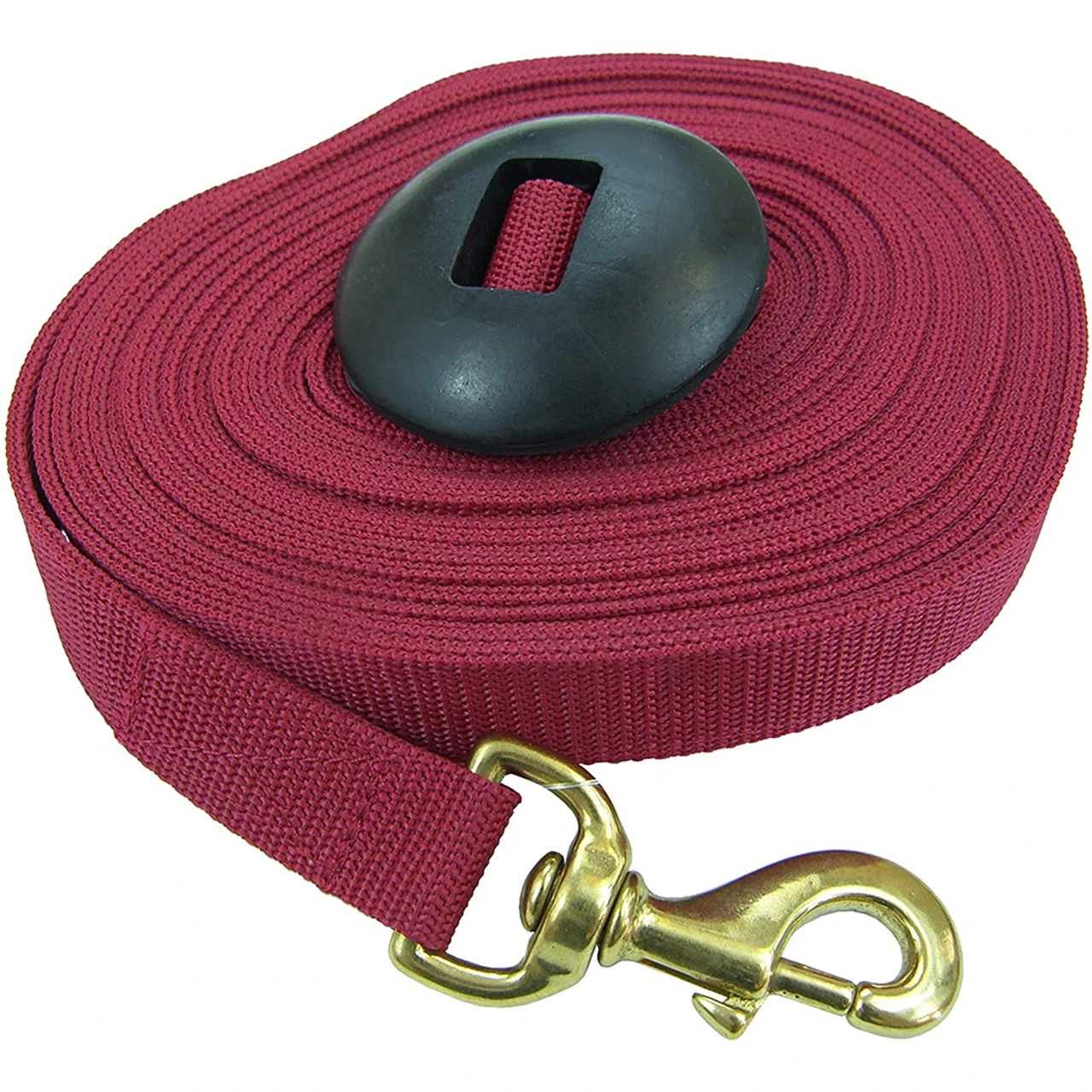 Poly Lunge Line 25 feet with big rubber doughnut at the end. This great rubber stopper keeps the line from slipping out of your hands; a great thing when a loose horse would be embarrassing or at the least inconvenient!