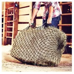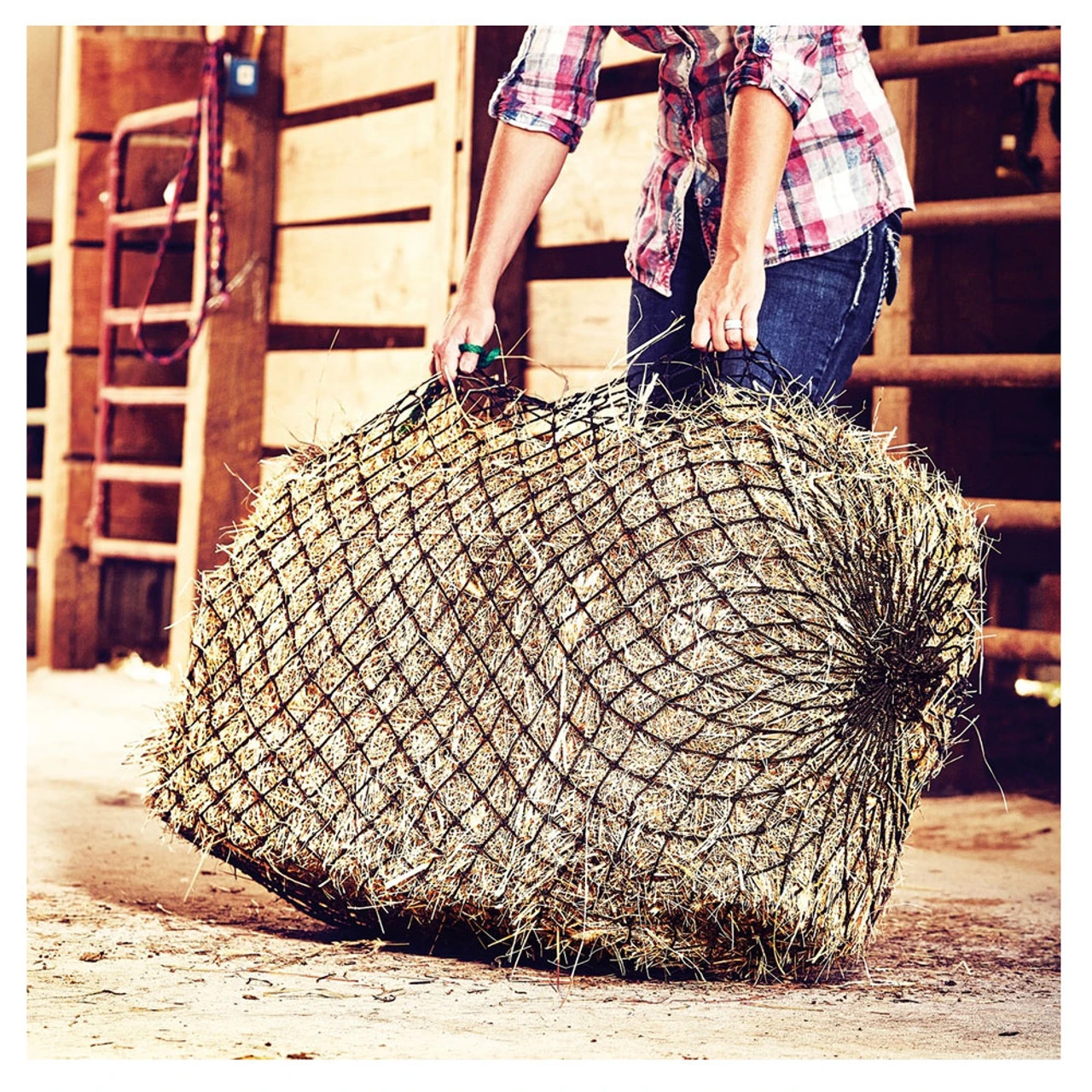 This slow feed hay net is ideal for feeding an entire 3 string square bale. The Texas Haynet 3 String Square Bale Net helps prevent colic, founder, and ulcers by slowing down consumption to a natural pace. This bag eliminates clean up and keeps them busy longer. Perfect for the stall or pasture.