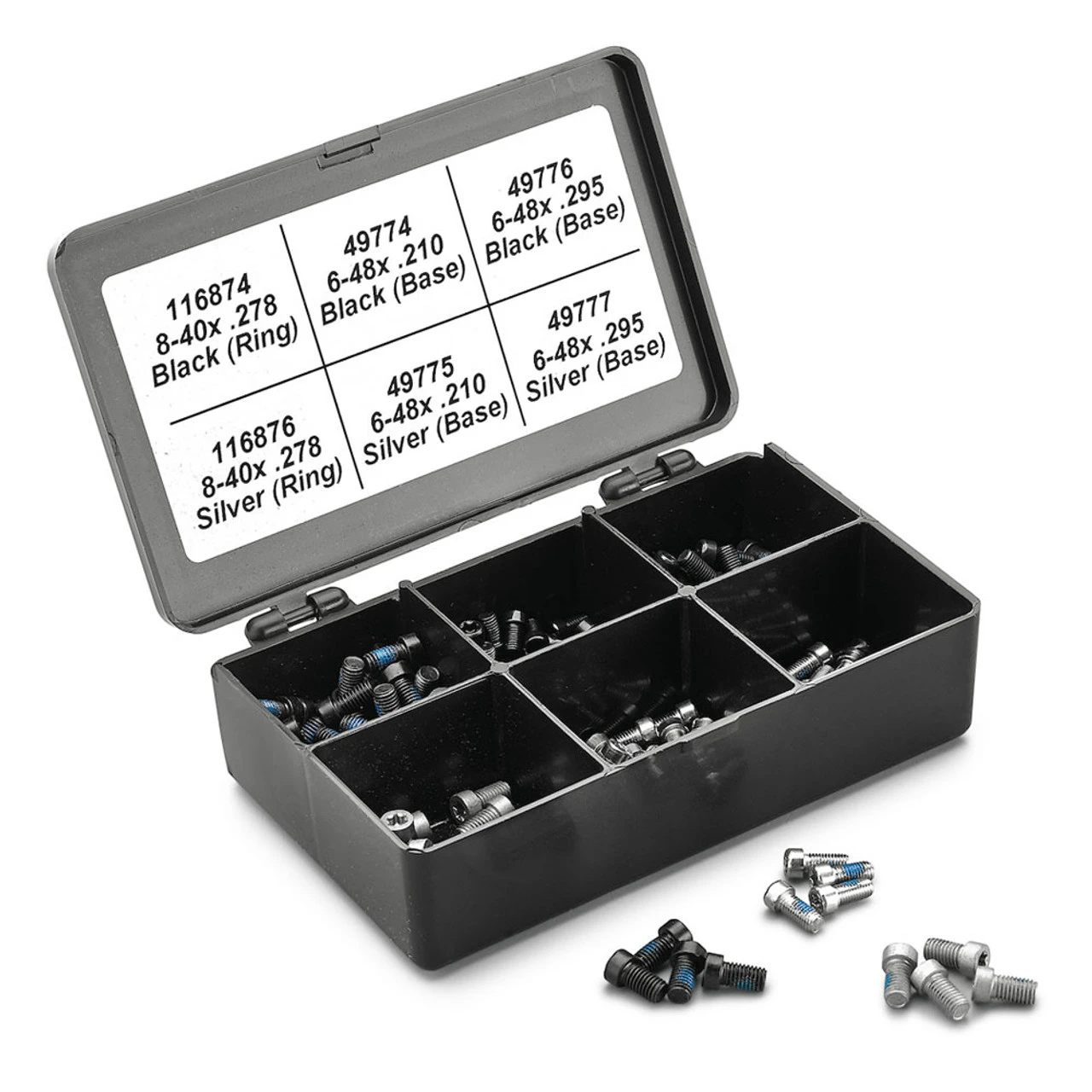 The LEUPOLD Torx Screw Kit includes an assortment of the most often used Torx base and ring screws, in both black and silver. The black polymer box’s sections keep the various sizes separate and organized.