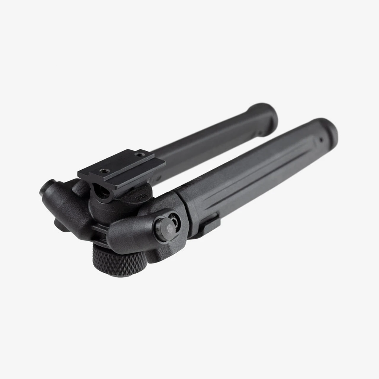 Deploying and adjusting the Magpul Bipod is quick and easy. Spring-tensioned legs stow neatly forward and snap down and lock into place with one hand. Leg extensions slide and lock securely with the push of a button on any of the seven half-inch spaced locking detents. The legs extend a full four inches, from 6.3″ to 10.3″. An industry-exclusive 50 degrees of total tilt and 40 degrees of total pan are controlled by a glove-friendly knurled tool-less bipod locking knob located between the extended legs, allowing easy adjustment between shots. Additionally, the Magpul Bipod has the exclusive ability to lock pan at 0 degrees while maintaining full tilt functionality.