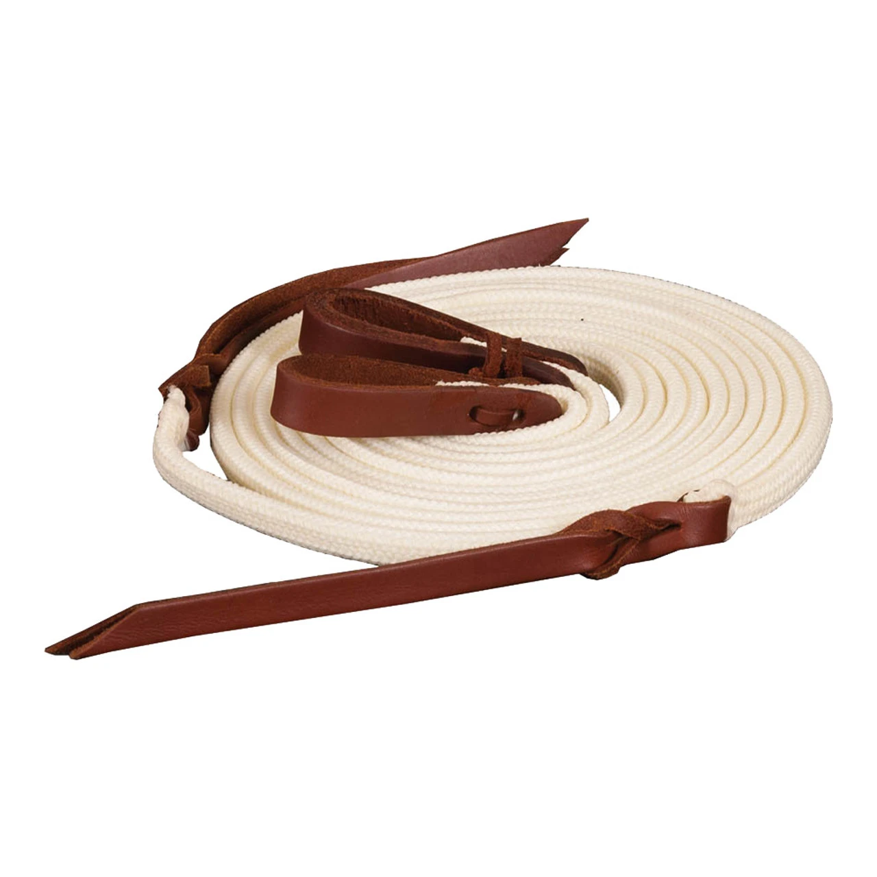 The Mustang Poly Braid 1/2inx 8ft Flat Split Rein (8130) with leather waterloop bit ends and leather poppers.