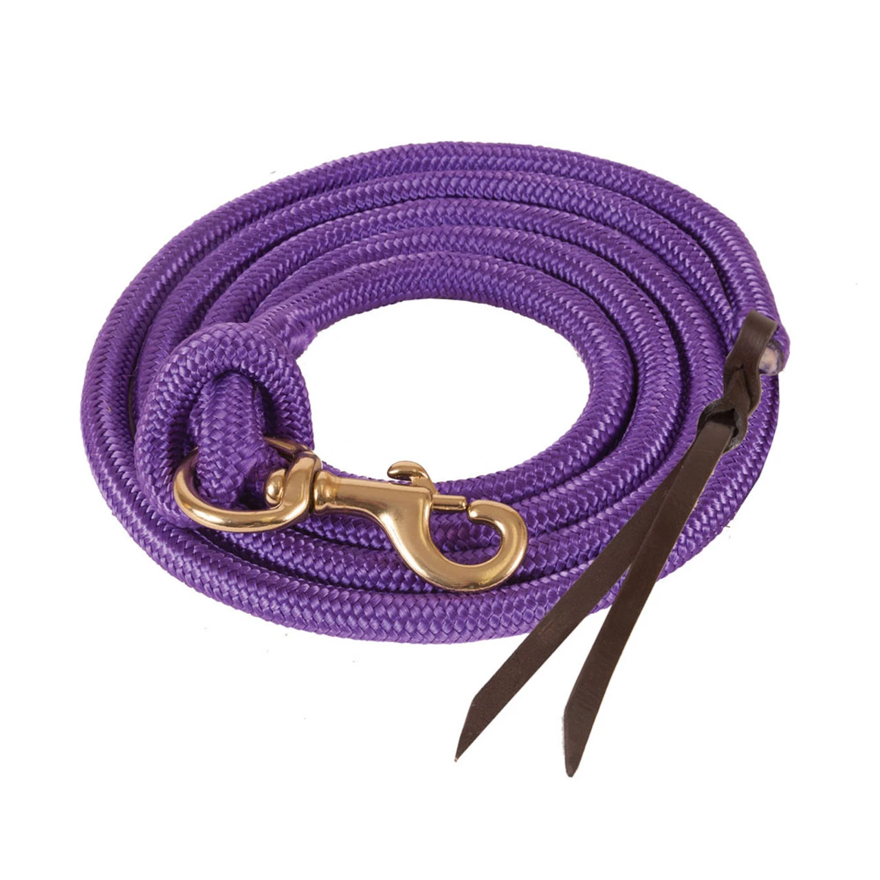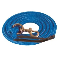 Mustang Poly Cowboy Lead Rope This is a 5/8″ x 9′ poly lead rope with a 7/8″ brass plated bolt snap with no clamp. It has a leather popper end.