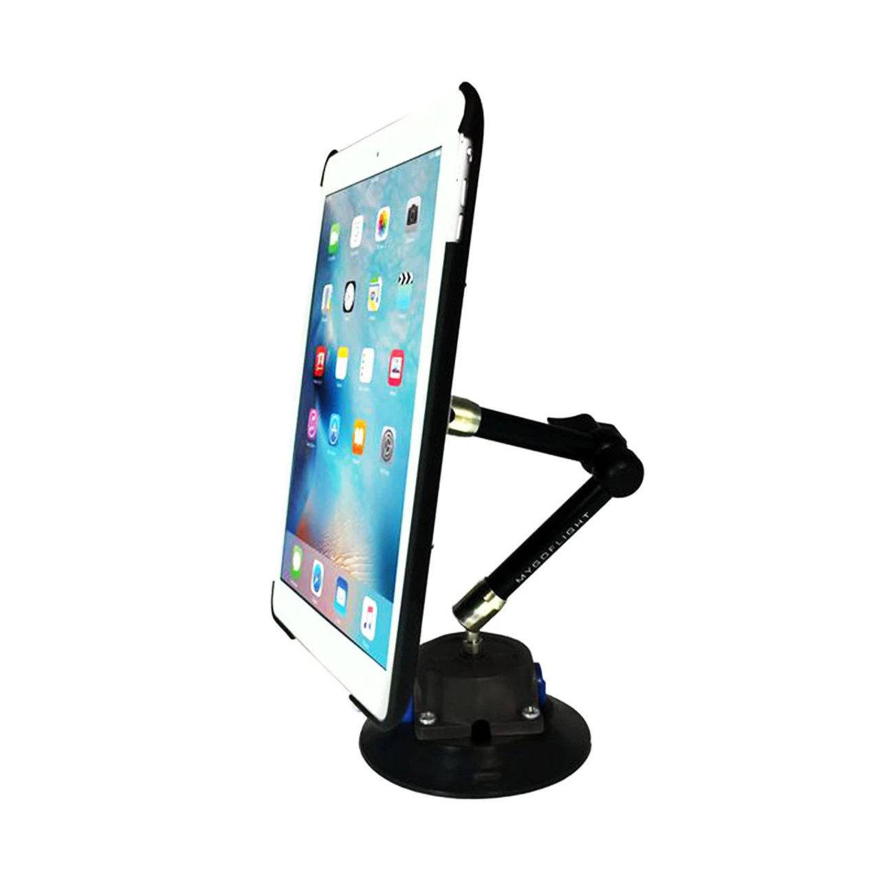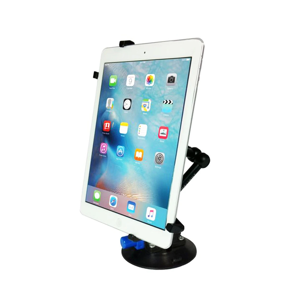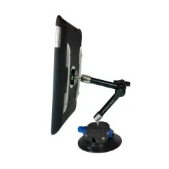 The Flex Suction Pro is an infinitely articulating and adjustable arm with the ability to hold any iPad or device. The Mount utilizes one vacuum suction cup with a built-in finger pump that informs you if the mount is losing suction. Give it a couple pumps and it is quickly back to full strength.
