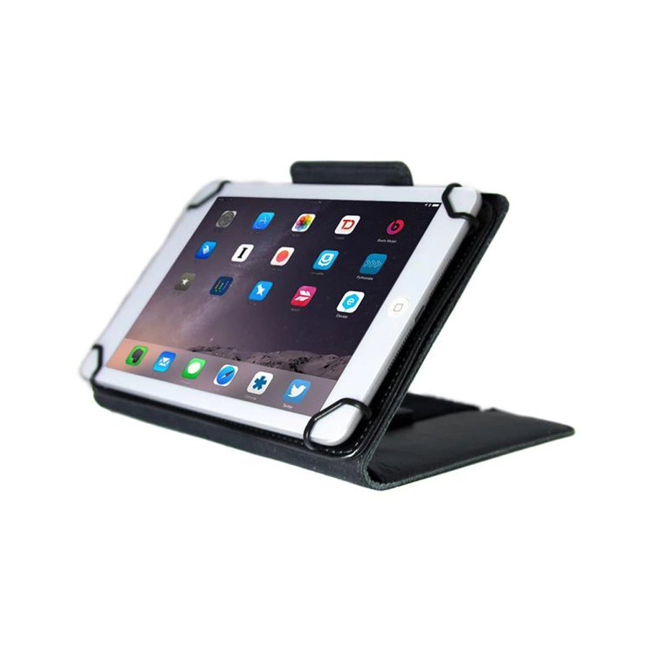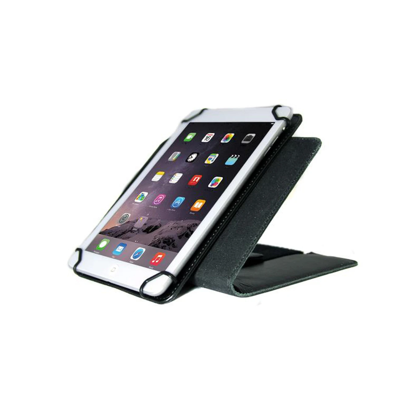 The iPad/Tablet is held by four adjustable clips that are attached to a rotating cradle. All of the ports and controls remain accessible so the iPad/Tablet can be charged, synced and controlled in the folio.