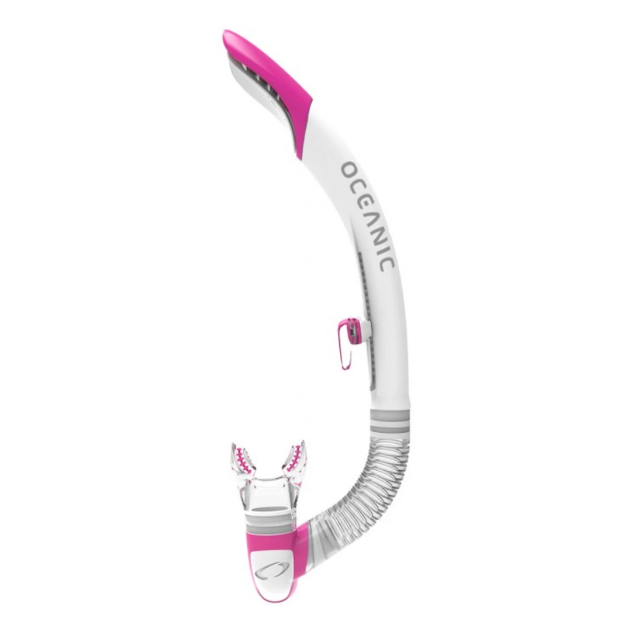The Oceanic Ultra SD (Semi-Dry) Snorkel employs a patent pending deflector to stay dry in waves and wind. The design also incorporates a drop-away flex mouthpiece, oversized purge valve for easy clearing and a 100% liquid silicone mouthpiece.