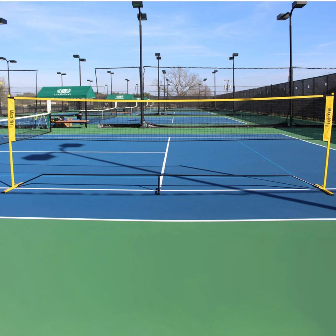 Solution: The 18-foot Maxi-Net sets up and breaks down in 2 minutes with no tools needed and no bungee connections that can break. The Maxi Net also adjusts in height from 30″ to 64″ making it the perfect net for not only tennis but also sports such as badminton and beginner volleyball (using beach balls). Maxi-Nets are approved by the United States Tennis Association for red level 36-foot court play. These nets are perfect for home, school, and club use. Plus, the raised middle poles allow for “back-and-forth” ball rolling games for beginning children!