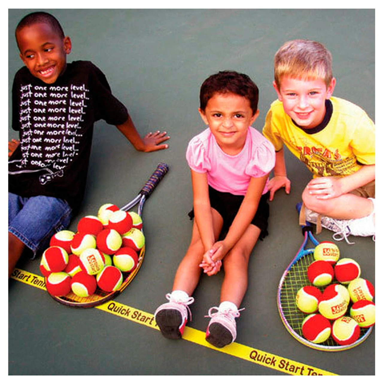 Quick Start 36 Red Felt Balls are 15% larger than standard tennis balls, increasing the success rate for beginning children in 10 and Under Tennis programs (and adults as well). Red Felt Balls are specifically designed and tested for 36-foot USTA recommended courts. The color-coded buckets offer both convenient and separate storage. Unique hinged bucket design facilitates ball access and storage.