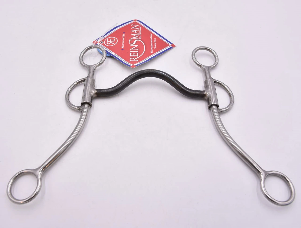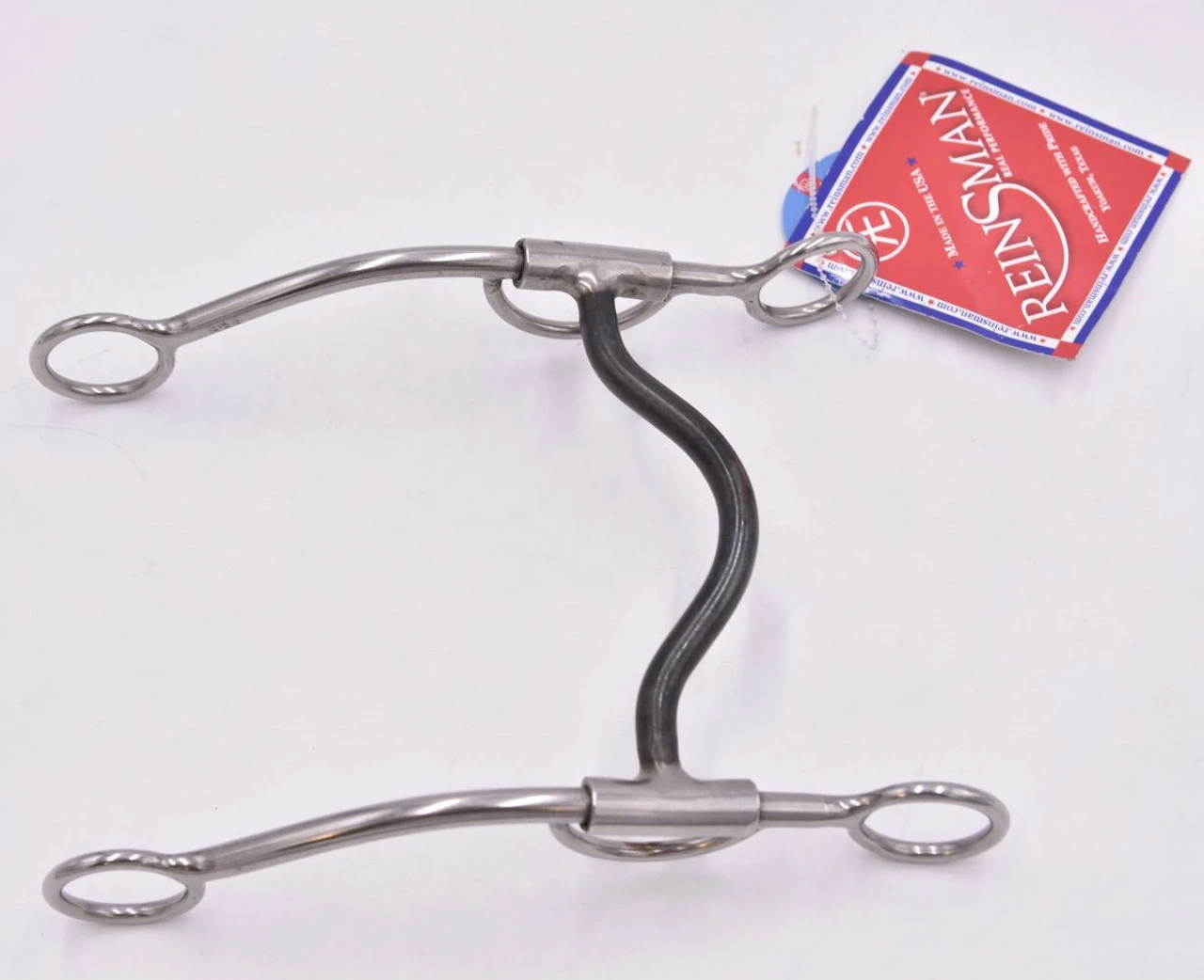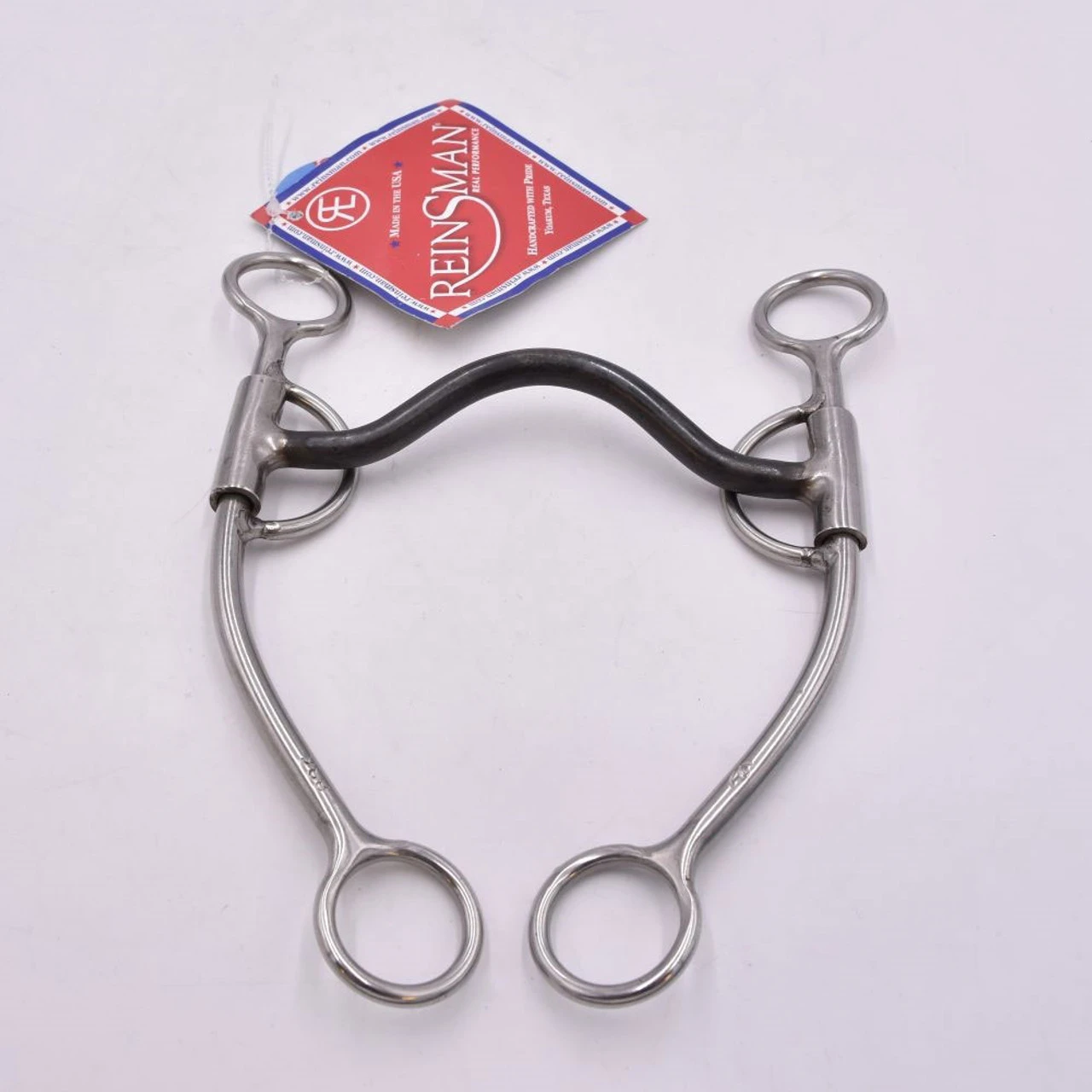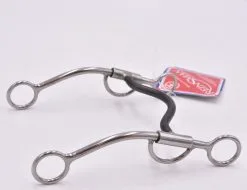 The German silver cheeks have a no-pinch ball hinge for good control. This helps encourage good to lift the head and shoulders, pull the horse a little more in the turns, and take more hold in the box. The 1 3/8″ low port chain mouth provides some tongue relief and conforms to the shape of the horse’s mouth for even dispersal of pressure. An excellent Circle Y Ported Mullen D & L Reiner Bit (836) for timed events.
