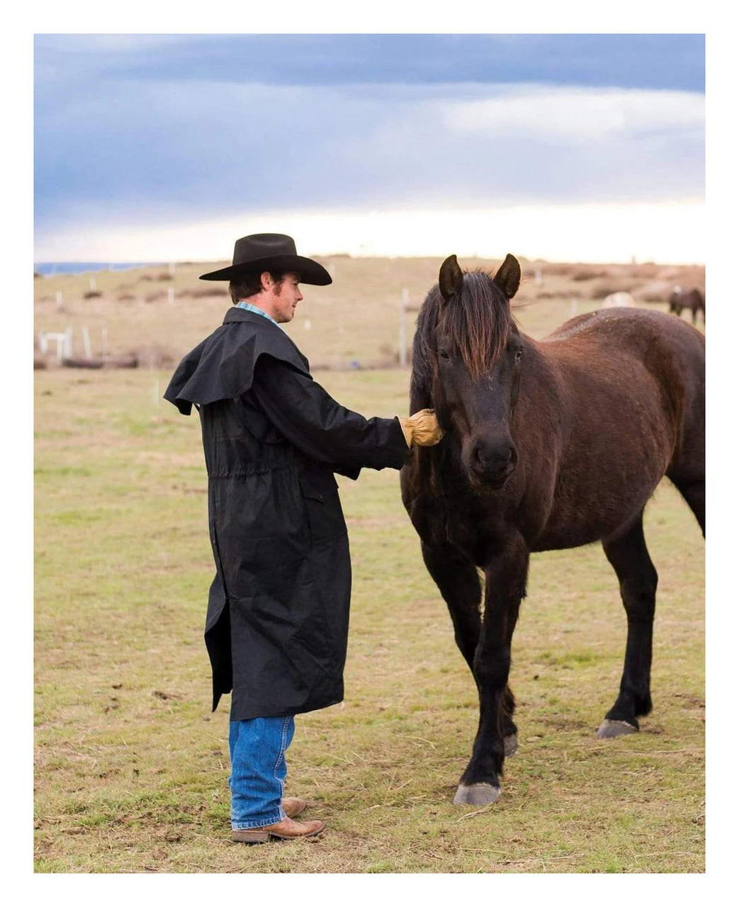 Waterproof – The Stockman Duster is made with a waterproof cotton oilskin fabric infused with oil. Rain rolls right off your back as quickly as it falls.