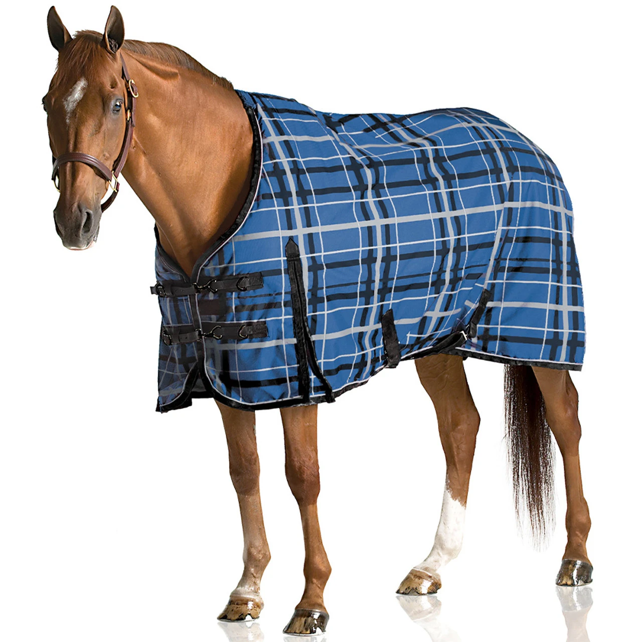This top of the line Waterproof-Breathable Turnout blanket from Pessoa features a 1200 denier waterproof breathable Oxford polyester outer shell, 180 gram insulation, and 420D quick-dry nylon lining. Patented Exceler closure system where you adjust the front closures just once and there after just snap the blanket closed. Hook & Loop sandwich closure adds to the security. Other features include: standard 16″ shoulder gussets, fleece wither, dual low cross flexi t-lock surcingles, four rear inside d-rings with double bolt snap elastic adjustable removable leg straps, rustproof satin finish hardware, reflective Pessoa logo on both sides, reflective piping, and large umbrella tail flap.