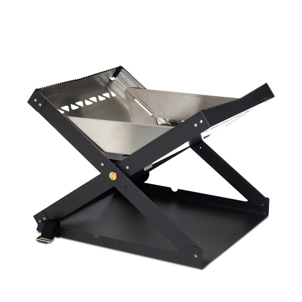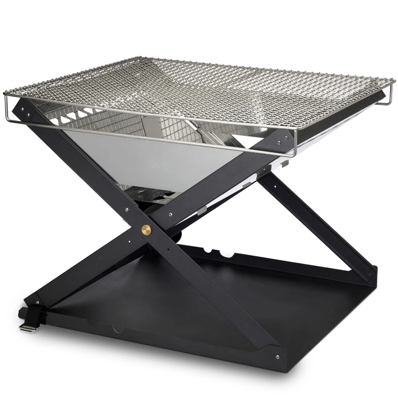 In addition to any campsite or rafting rig, this leave-no-trace, use-anywhere fire pit is ideal at the beach, your backyard, or even a parking lot tailgate party. The integrated ashtray/base protects the ground from heat or embers. A removable grill grate is ideal for open-fire cooking. The powder-coated frame is stable and robust for countless campfires.The stainless steel windshields and the air inlet tray combine for efficient combustion.