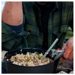 The PrimeTech pot is made of hard anodized aluminum, which has good heat distribution and does not rust. It also has a ceramic non-stick coating on the inside, which facilitates the cooking and cleaning. The second pot is made of hard anodized aluminum, with a traditional design without heat exchanger. Both of the pots are 1.3 liters, good for 1-3 people. A transparent lid in Tritan reg; with an integrated strainer and heat-resistant silicone handles which make it easier to take care of certain tasks such as pouring pasta water. The smart gripping tongs are as steady as a fixed handle and flexible as a conventional gripper and can be locked in the pan for easy and safe handling. Primus Prime Tech pots work well with all of Primus stoves.