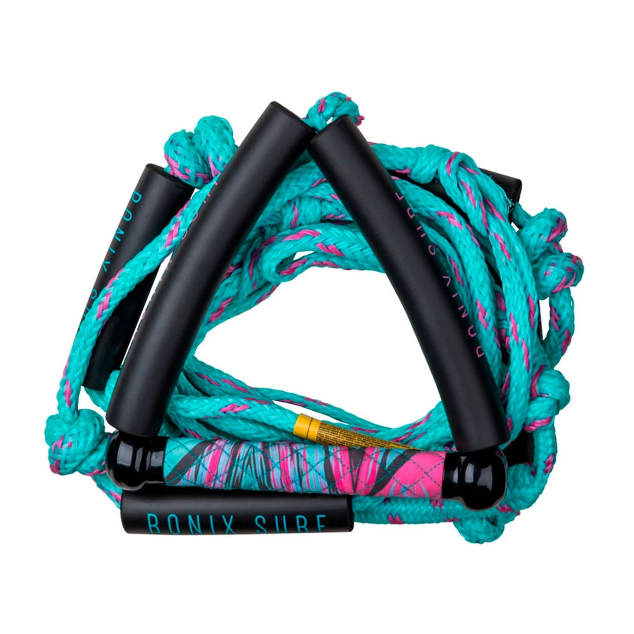 The Ronix Women’s Stretch Bungee Surf Rope has a 10-inch handle with a Tacky Lycra grip. This is a 25-foot rope with 4-sections of adjustability to put you in the sweet spot. The 2-foot bungee section makes learning super easy because it eliminates the hard tug from the boat.