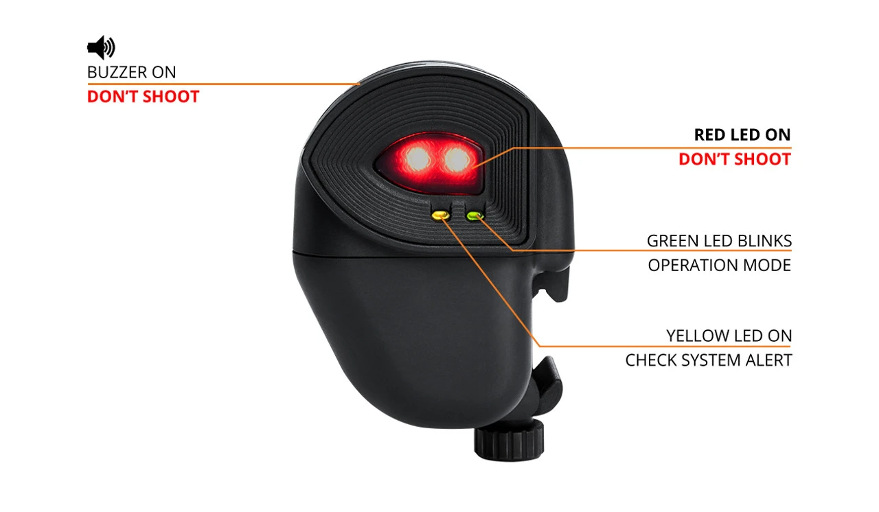 The SAFESHOOT Shooter device can detect other Shooter devices and Non-Shooter Defender devices that are in the line of fire. When taking aim, SAFESHOOT alerts shooters immediately and automatically if another SAFESHOOT device is downrange and in the line of fire. SAFESHOOT alerts shooters visually and audibly thus assisting in preventing an accident.