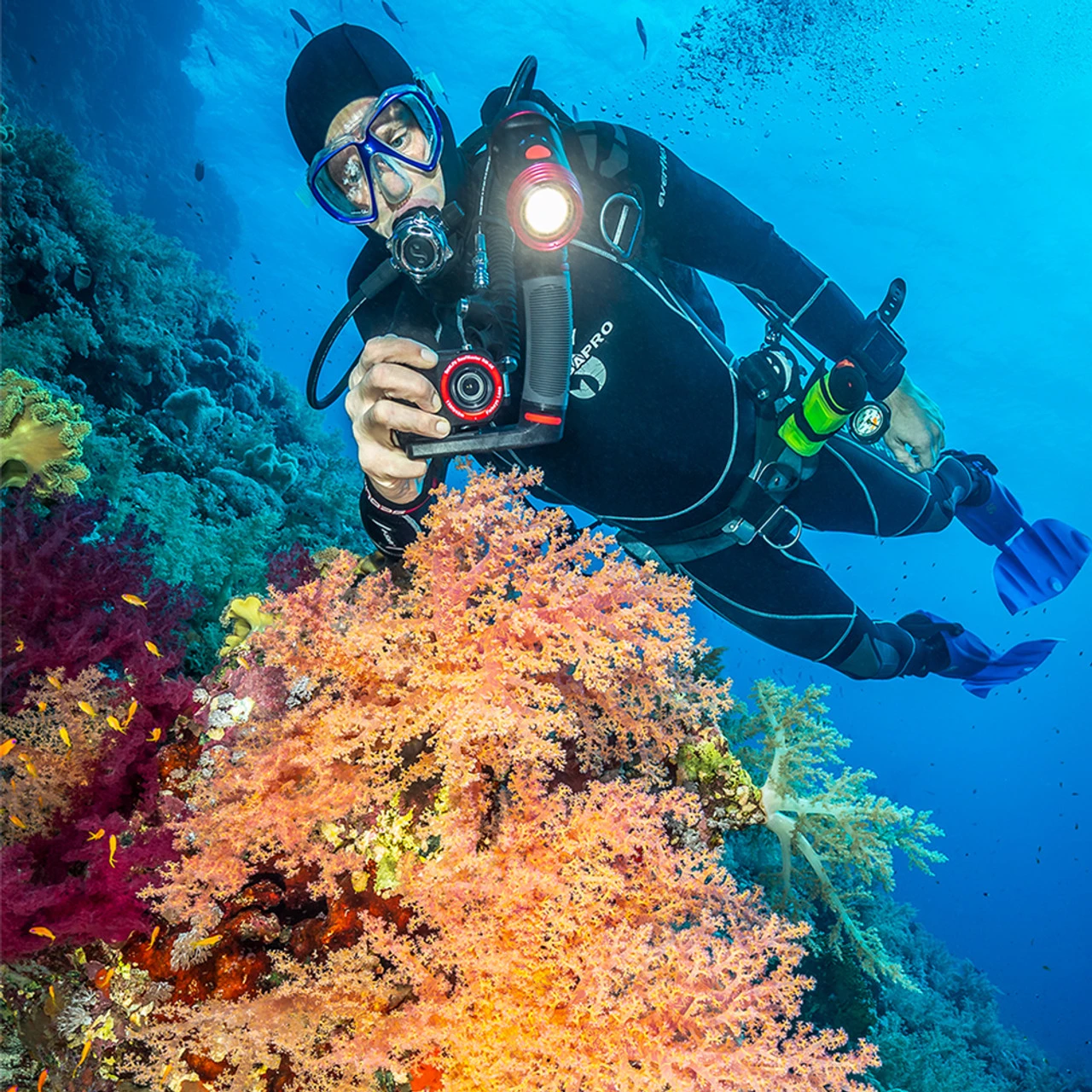 The SEALIFE ReefMaster RM-4K Pro 2000 Set combines the compact and easy to use ReefMaster RM-4K with the wide beam of the Sea Dragon 2000F. It is the perfect compact package for exploring reefs, wrecks and deeper dives where lighting will make your images and videos shine with color.