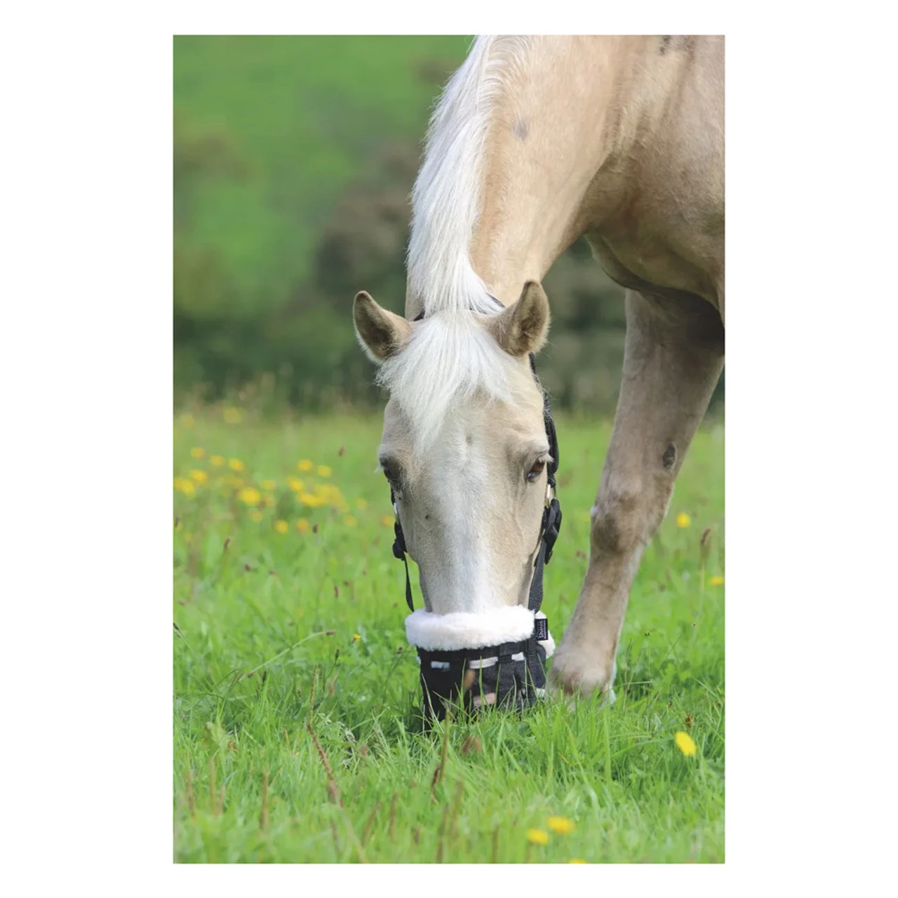 These Shires Deluxe Comfort Grazing Muzzles (495NF) are proven to help with controlled or restricted feeding regimes and special diets. The Comfort Grazing Muzzles are cut back under the chin to avoid unnecessary pressure and improve the fit. The muzzle features a rubber base with a hole in the bottom through which grass can enter, reinforced nylon web bars which allow free air exchange and the anti-chafe padding around inside of the muzzle protects the delicate nose and chin.