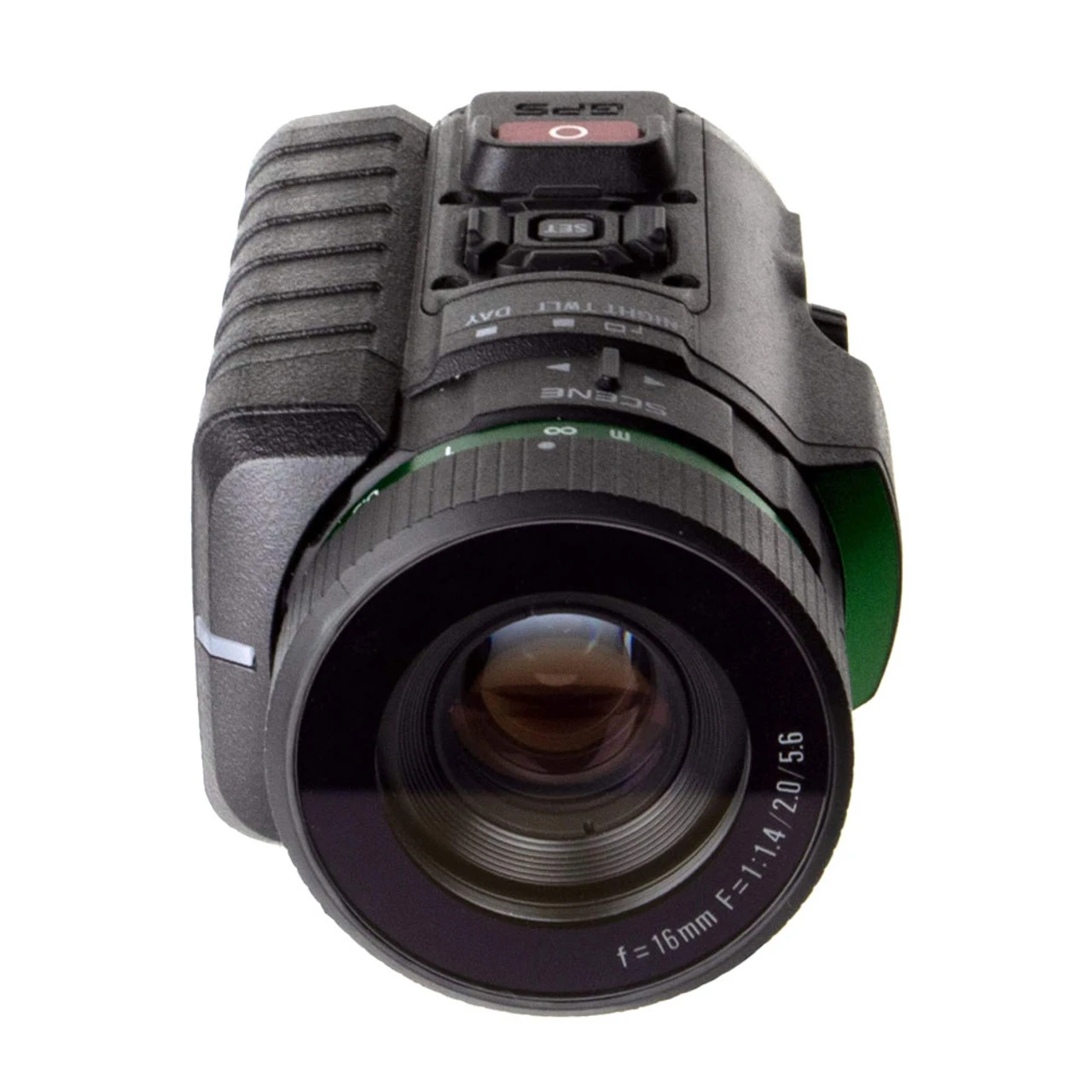 The Aurora camera features an all-glass 16mm lens with 3x digital zoom and f/1.4, 2.0, and 5.6 aperture settings. You can view your activities in color or monochrome using the OLED viewfinder. A diopter on the EVF offers a sharp view for users with and without corrective lenses. The camera offers Daytime, Twilight, and Night modes with the white balance set automatically to each mode. A focus peaking function and a manual focus ring are used to keep your images sharp. The Aurora also lets you live stream your content using the companion Aurora iOS/Android app.