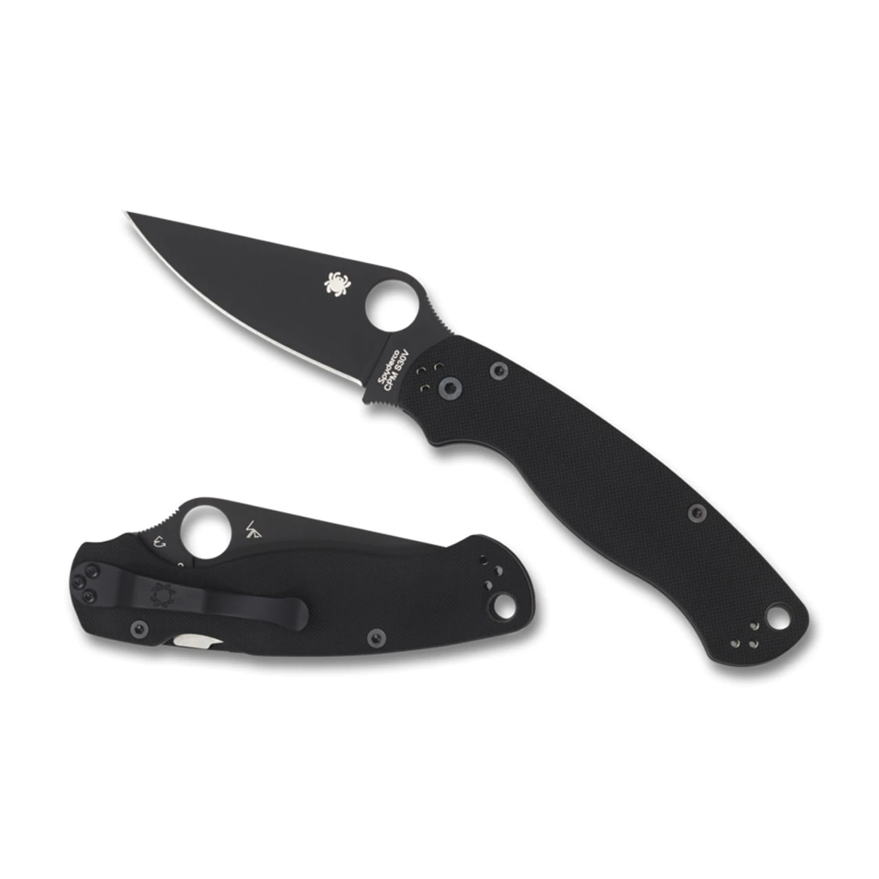 The Para Military 2 has a high-performance CPM S30V full flat-ground blade but Spyderco’s lengthened the blade’s tip and added additional surface jimping to both the spine and finger choil, then Spyderco’s coated it in non-reflective DLC (Diamond-Like Coating). Screw-together handle components, the pocket clip and the blade are coated in black to inhibit the folder’s reflective qualities.