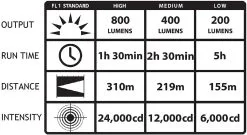 - High for maximum illumination: 800 lumens; 310m beam; runs 1.5 hours