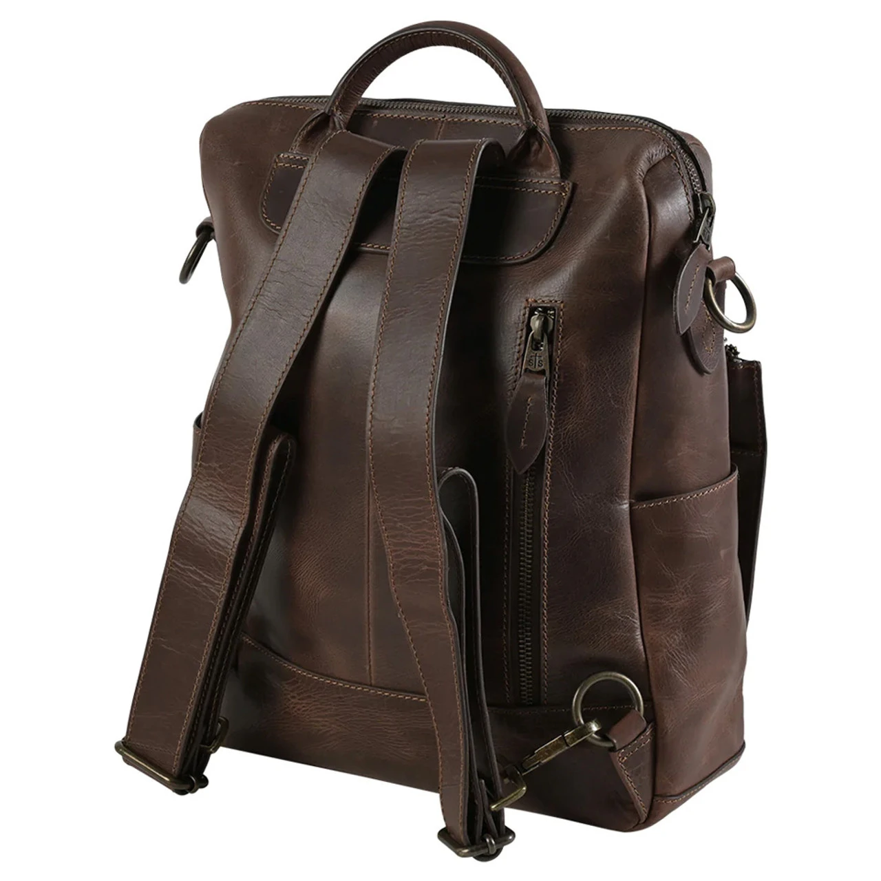 - Adjustable leather shoulder straps; Leather rolled handle