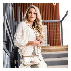 The STS Flaxen Roan Evie Organizer (31182) is crafted in a golden, metallic full grain leather that is buffed for a casual feel and finished with a glamorous, golden metallic shine. This model has an adjustable and removable leather crossbody strap.